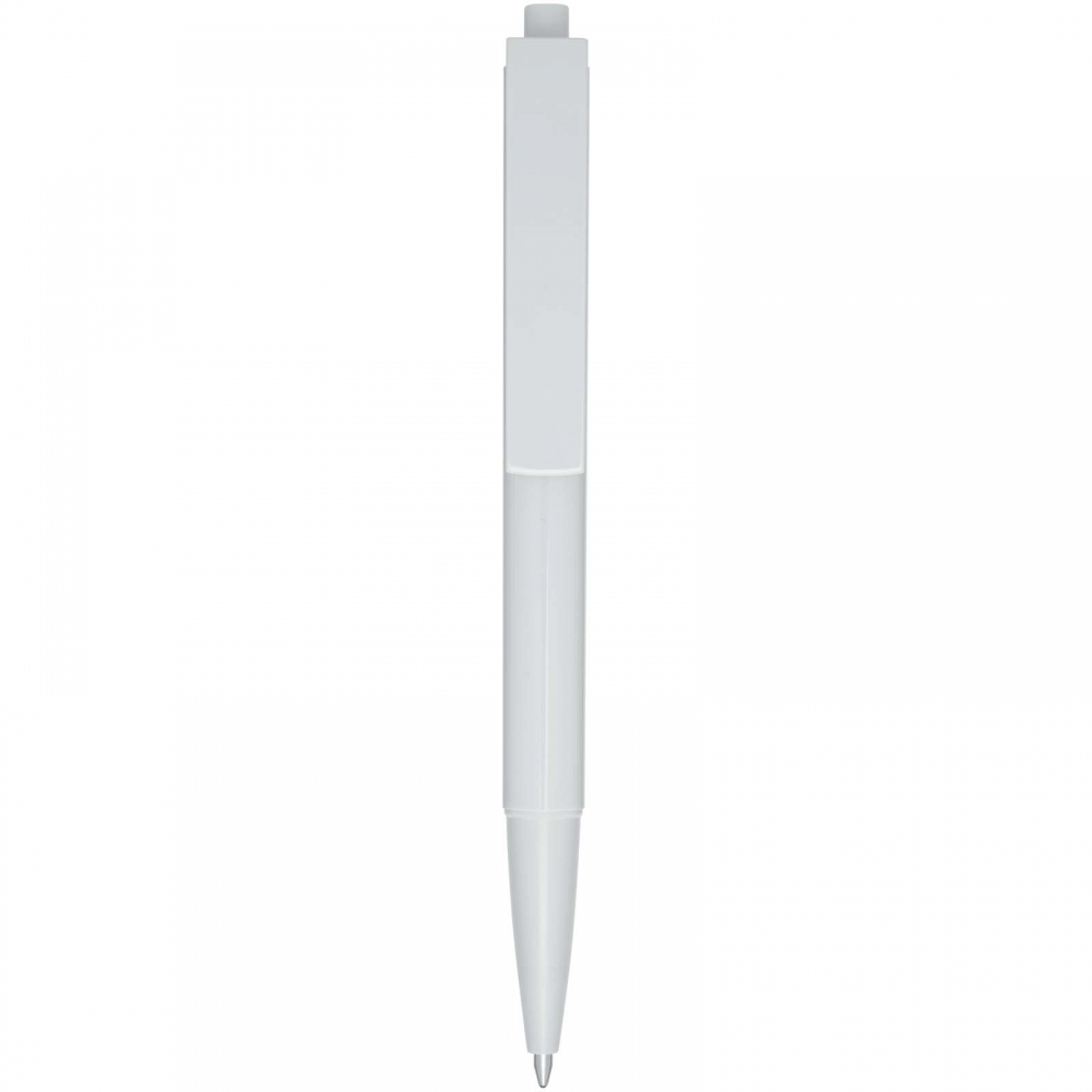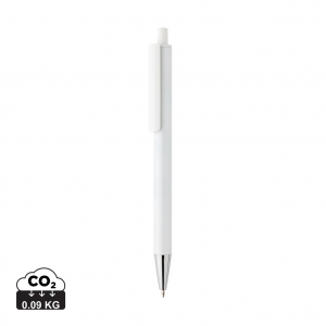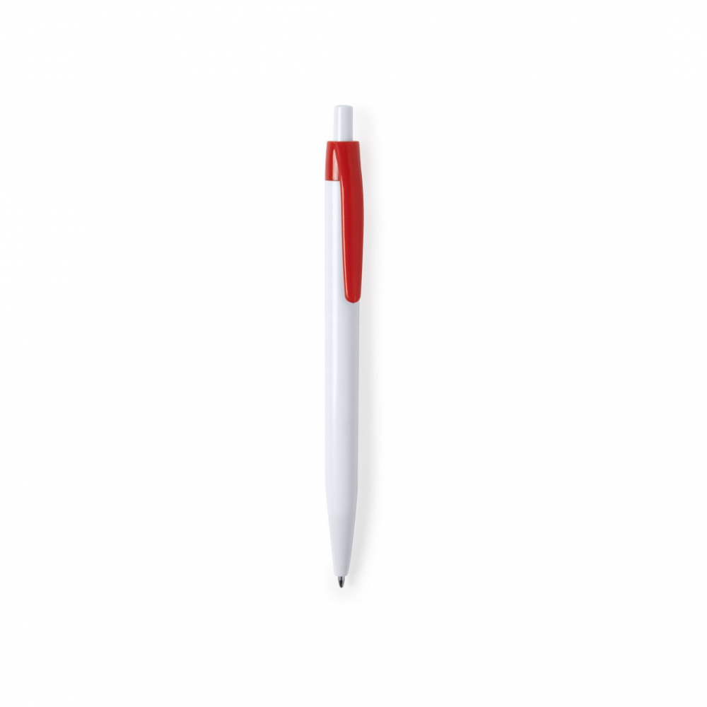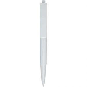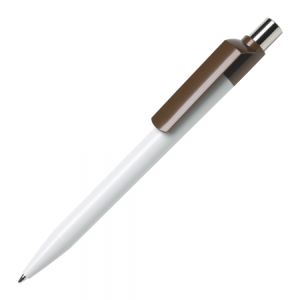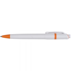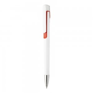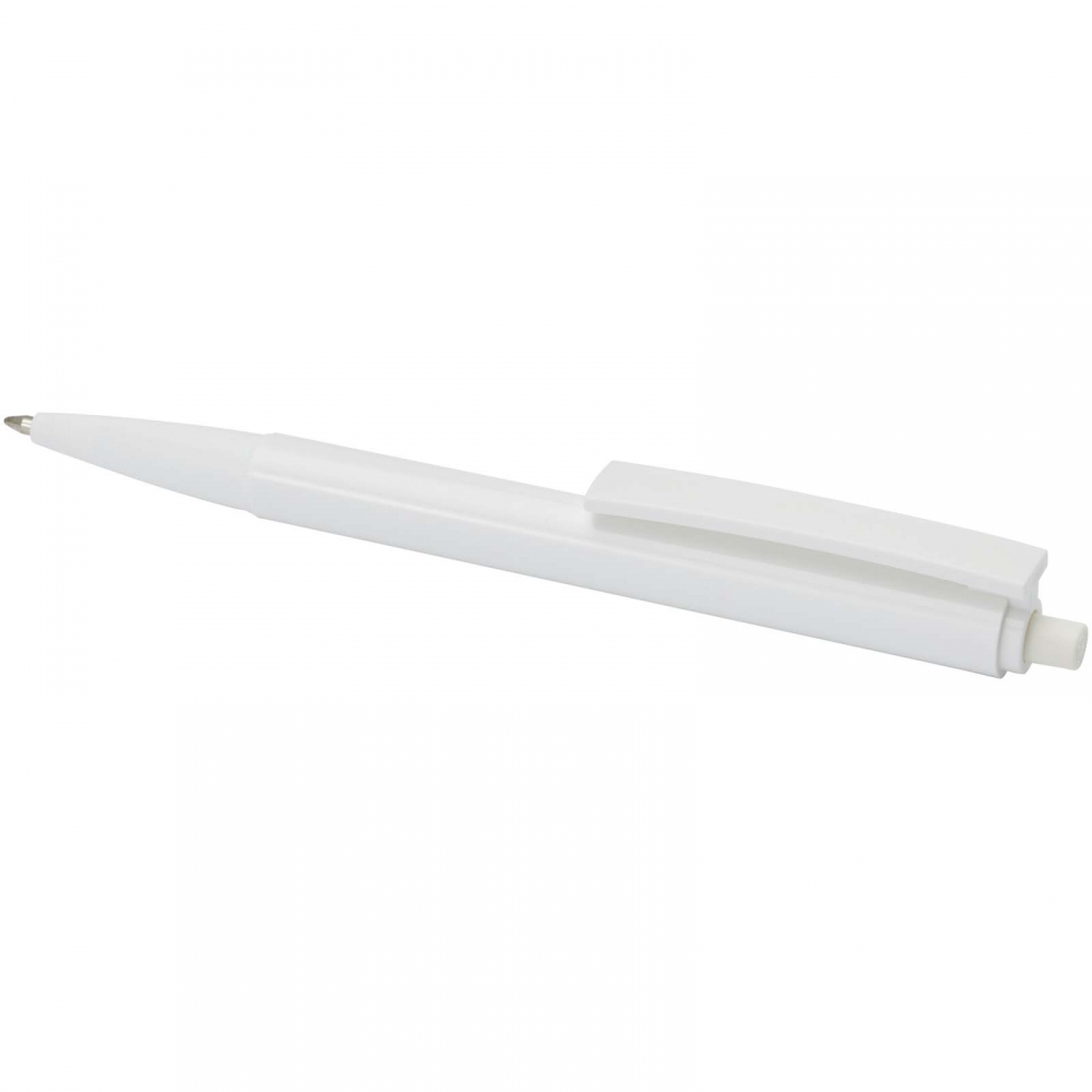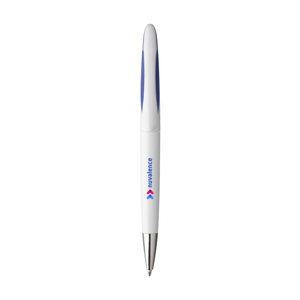 Kugelschreiber mit Push-up-Mechanismus in auffälligem, zweifarbigem Design. Gehäuse in weißer Farbe und Clip in verschieden breiten Farben. Großer Druckbereich und blaue Tintenmine.