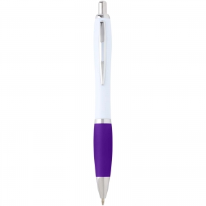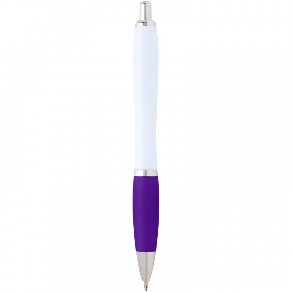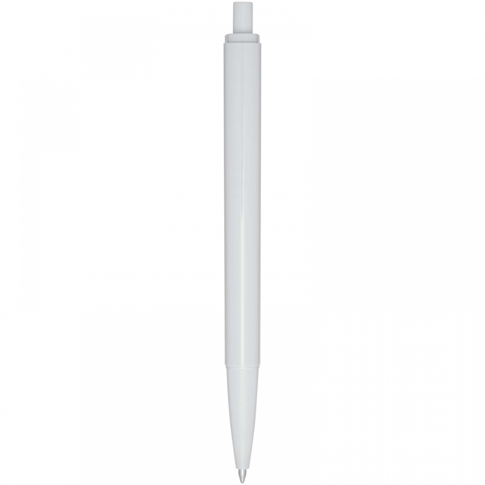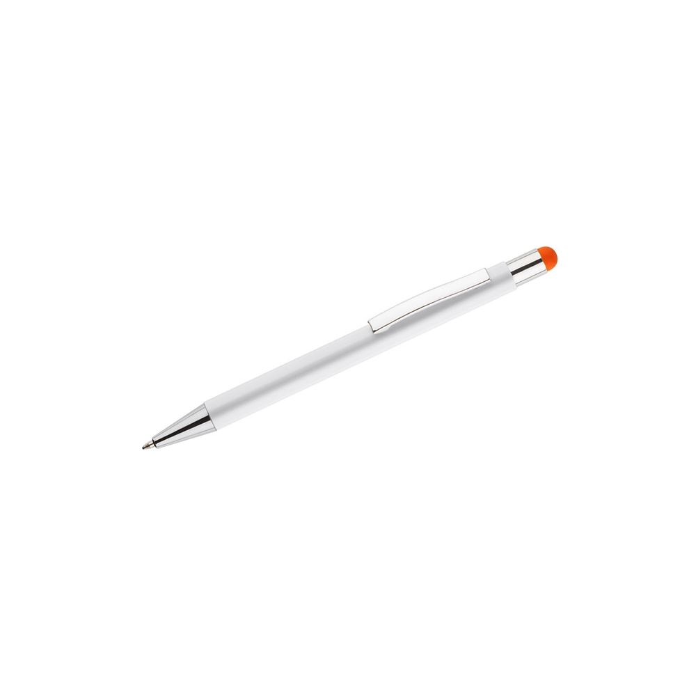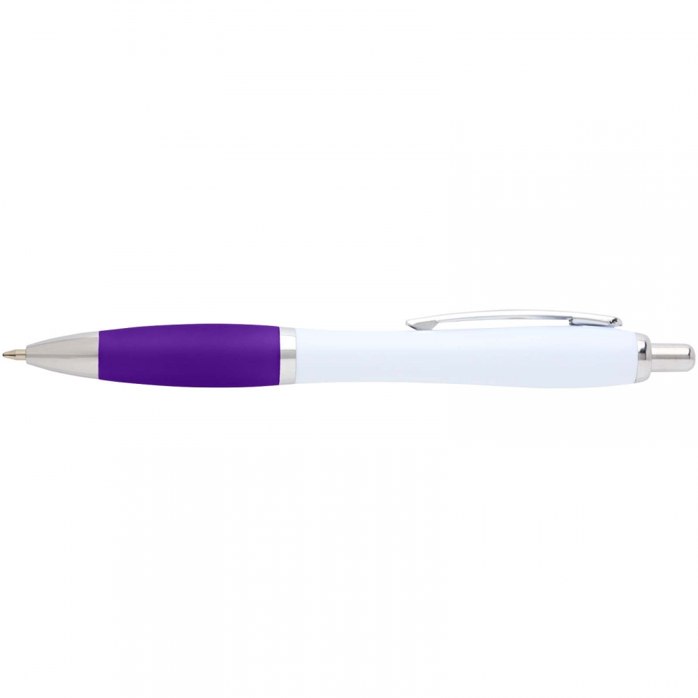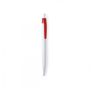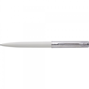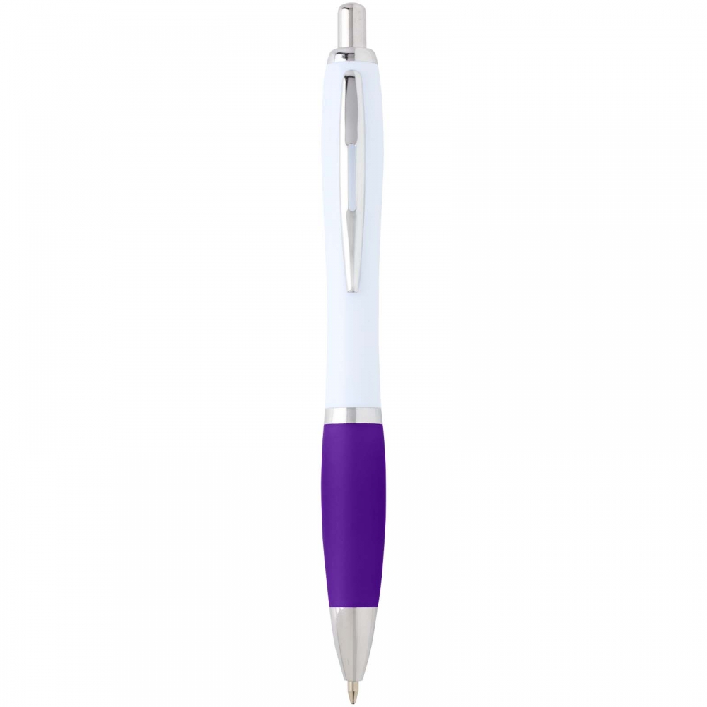 Kugelschreiber mit Push-up-Mechanismus in auffälligem, zweifarbigem Design. Gehäuse in weißer Farbe und Clip in verschieden breiten Farben. Großer Druckbereich und blaue Tintenmine.