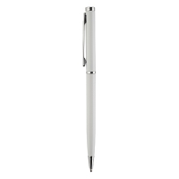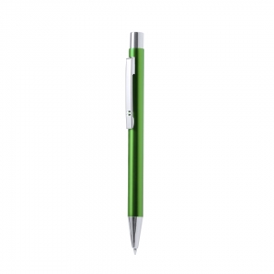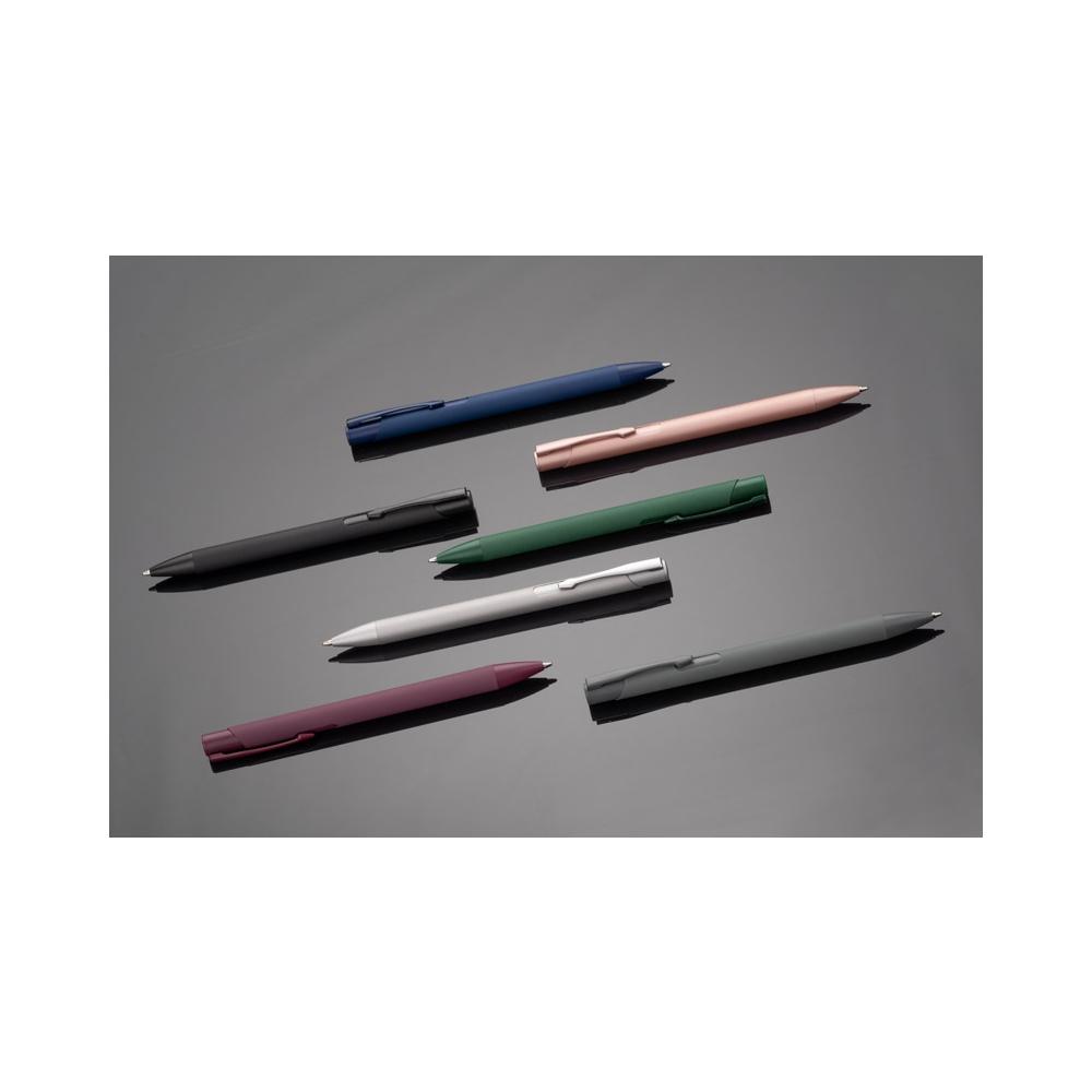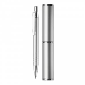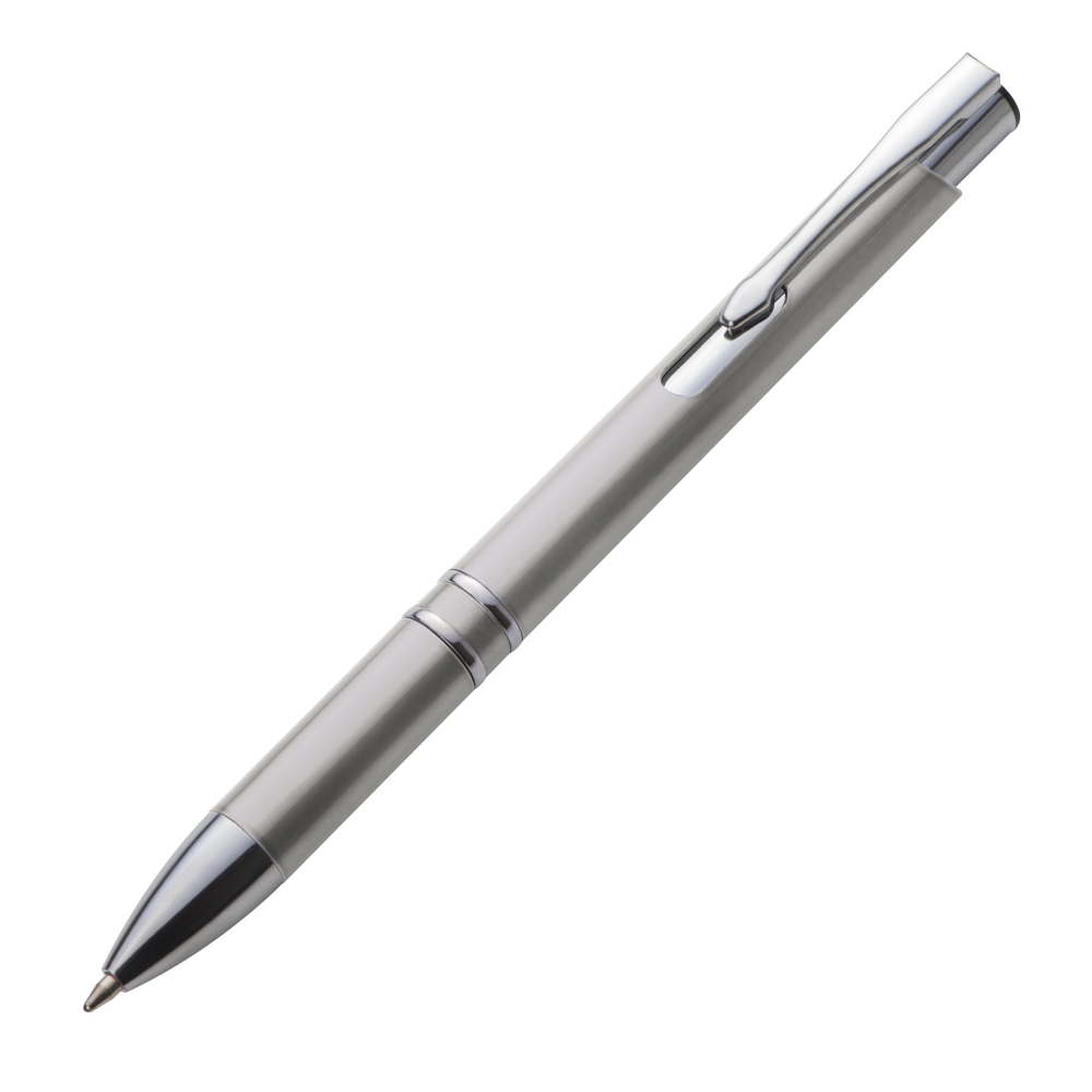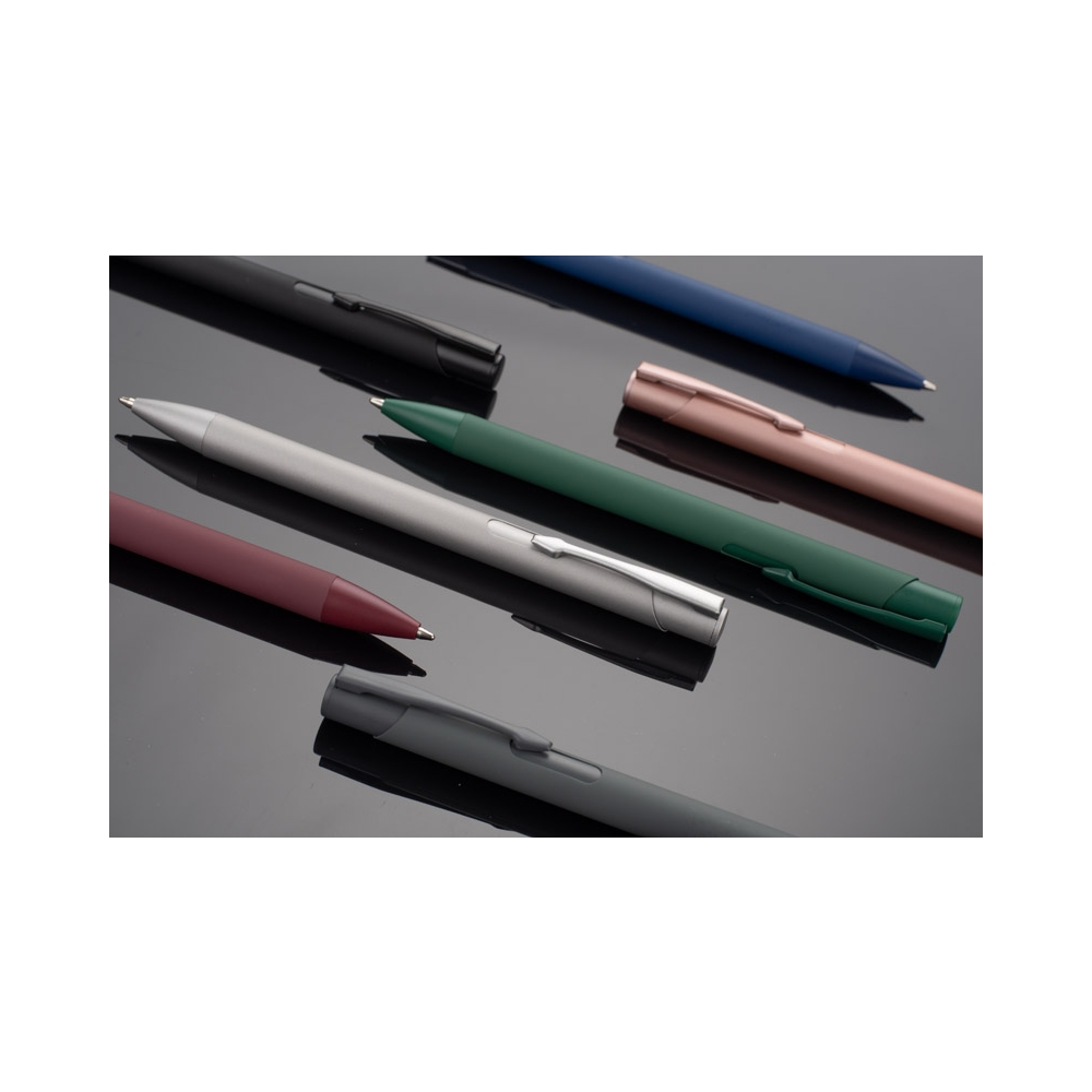 Blauschreibender oder schwarzschreibender Kugelschreiber aus Aluminium mit mattfarbenem Gehäuse in Metalloptik und metallenem Clip / Druckknopf.