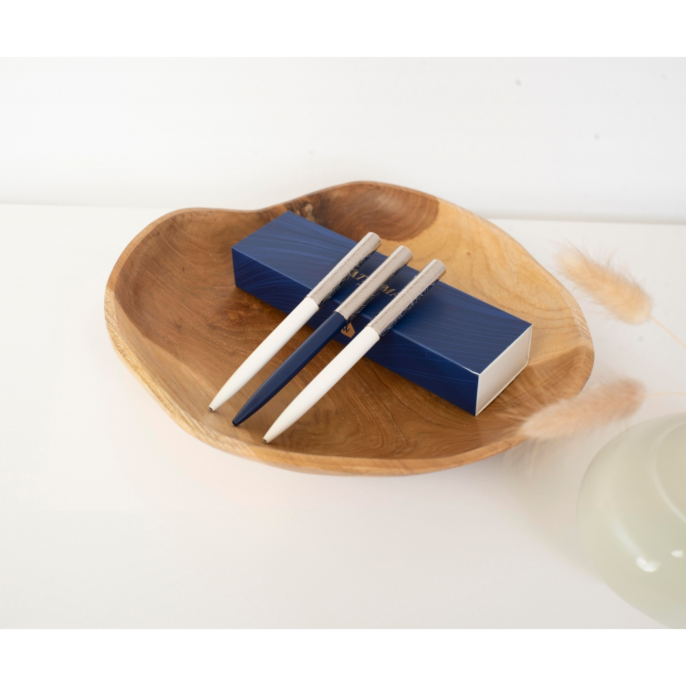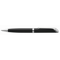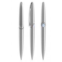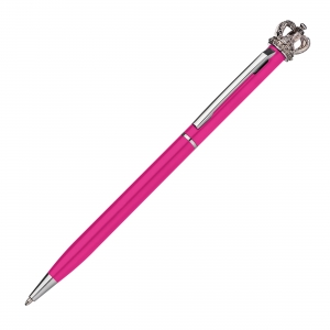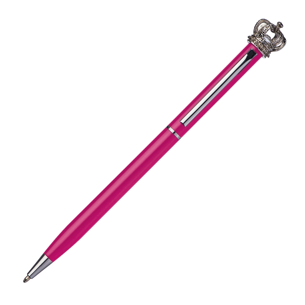 Schlanker Drehkugelschreiber aus Metall mit blauschreibender Metallsystemmine. Die Krone sowie der kleine Glitzerstein machen diesen Kugelschreiber einzigartig. Die Werbung wird rechts vom Clip gelasert.