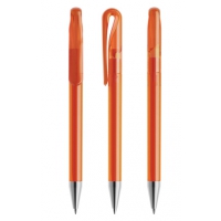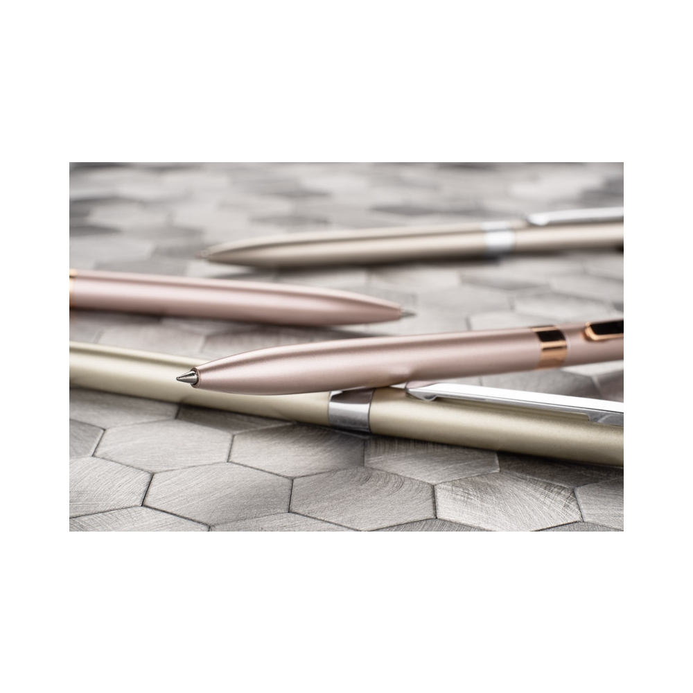 Er weiß, worauf es ankommt, selbstbewusst steht er für Wertigkeit. Minimalistische Klarheit mit allen Merkmalen eines anspruchsvollen Schreibgeräts. Sein statt Schein, ohne wenn und aber. In der Ausführung mit vollfarben poliertem Gehäuse (PPP) lieferbar in neun Standardfarben, Sondergehäusefarben ab 25.000 Stück. Vier Druckflächen für Werbeanbringungen stehen zur Verfügung. Der Druckknopf lässt sich farblich vom Gehäuse absetzen, verchromter Druckknopf als Option. Das hochwertige neue FLOATING BALL® Schreibsystem sorgt für ein noch weicheres Schreibgefühl.