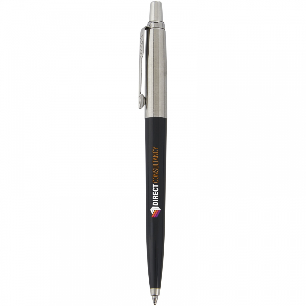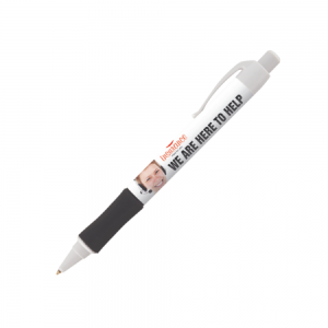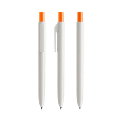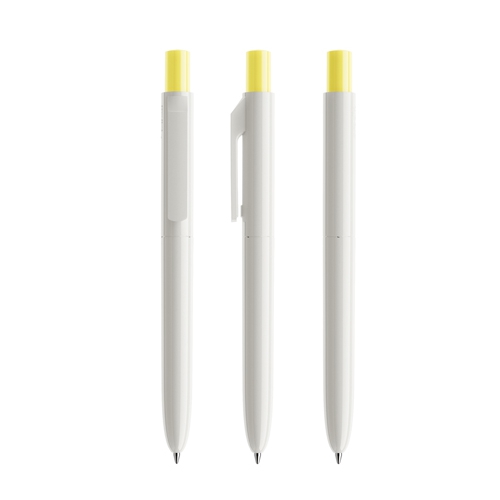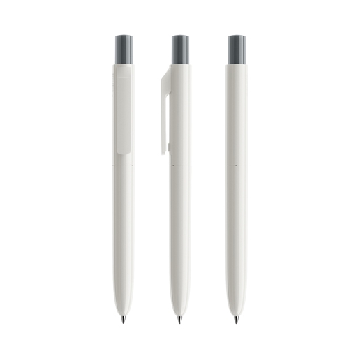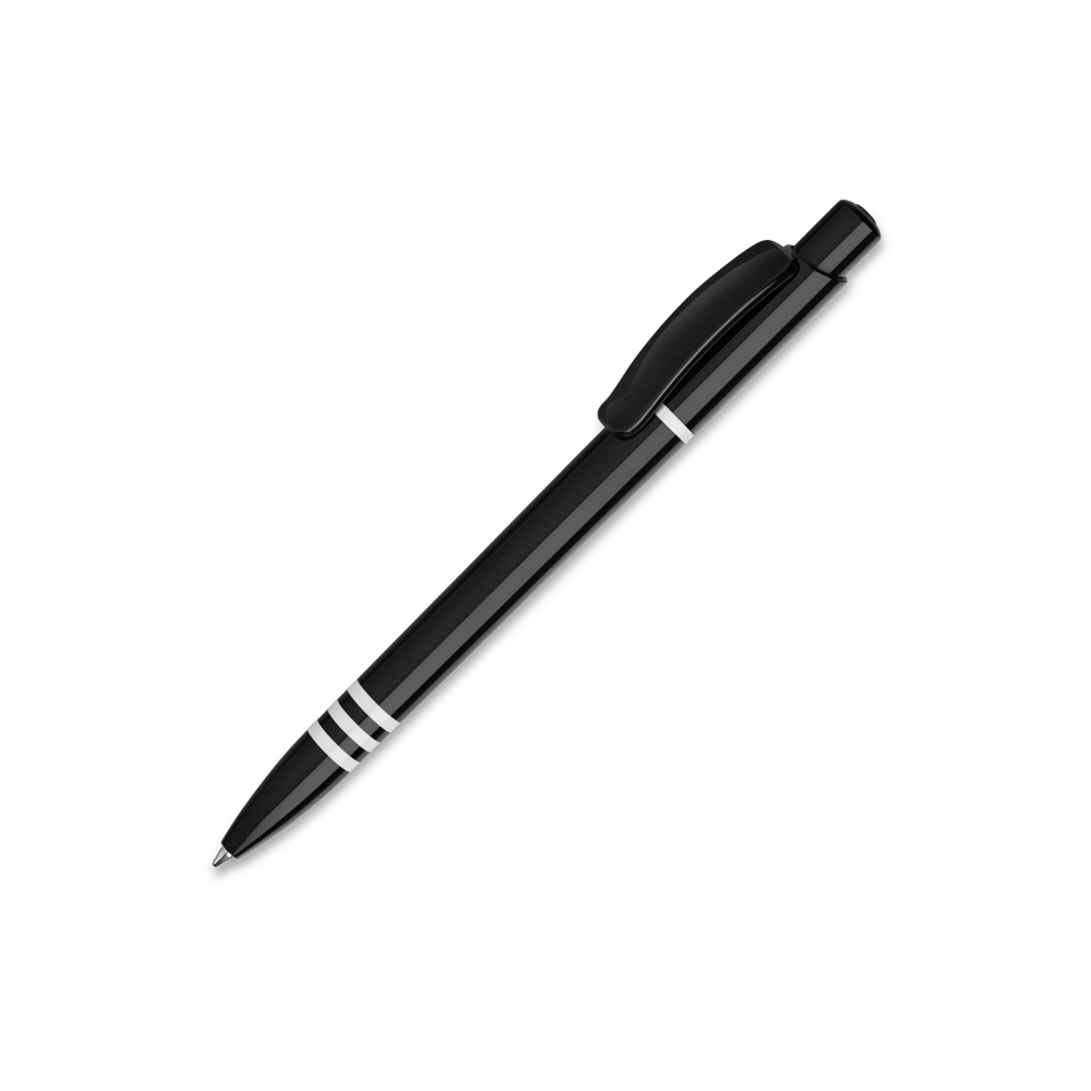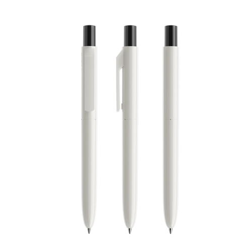 Druckkugelschreiber mit gedeckt weißem oder schwarzem Schaft. Clip und Drücker in gedeckt weiß oder schwarz bzw. transparent glänzenden Farben mit digitalem Folientransferdruck auf dem Schaft.