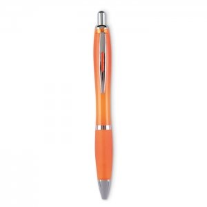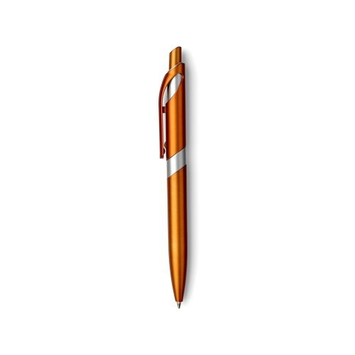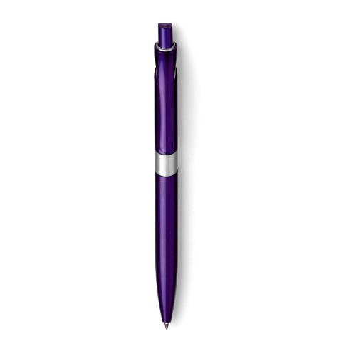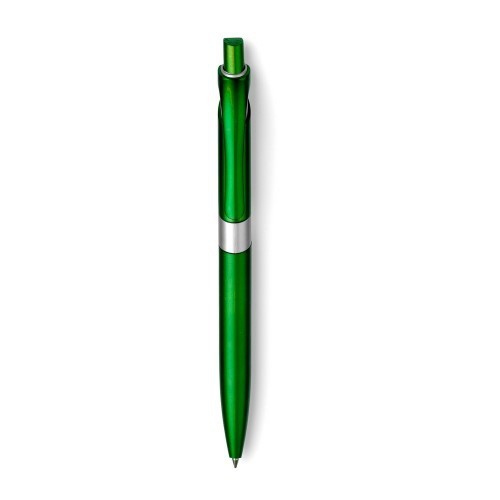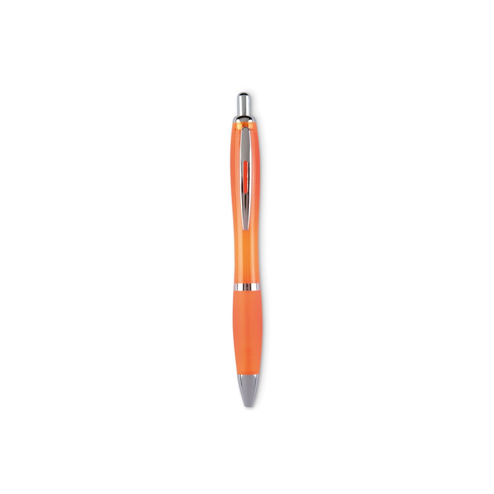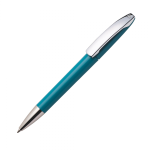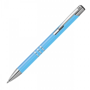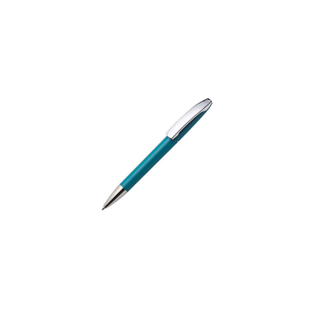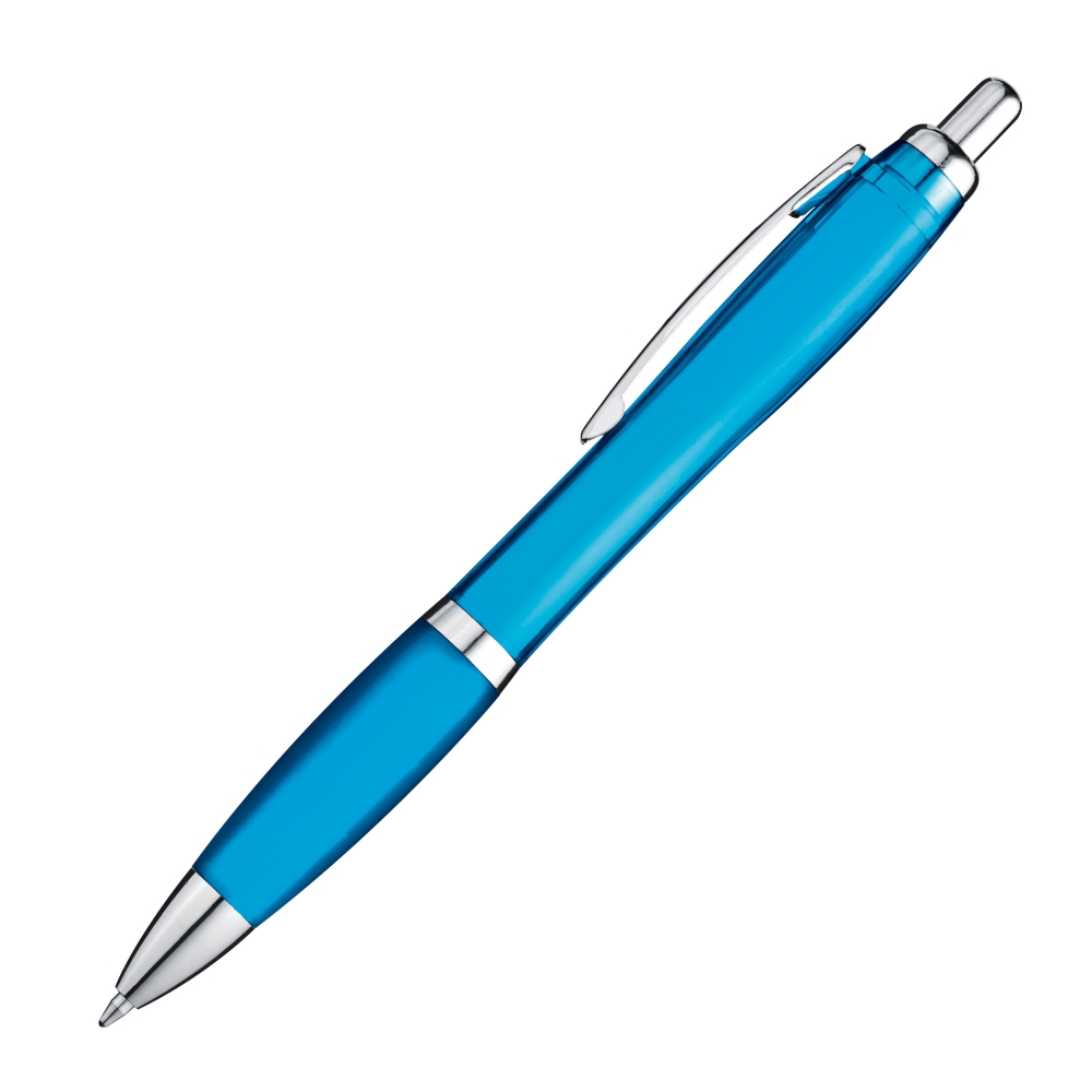 Kugelschreiber mit Druckknopfmechanismus aus robustem ABS. Stilvoller Schaft in verschiedenen auffälligen Farben, mit oberem Knopf, Clip und Spitze in Chromoptik. Blaue Tinte.