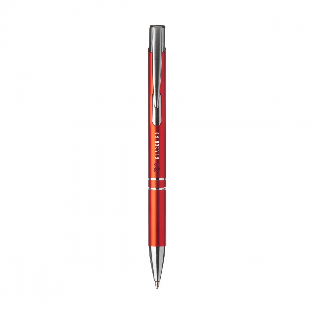 Kugelschreiber aus Aluminium in einer Vielzahl von glänzenden Farben. Mit originellem Clip und farblich passender Spitze - beide in matter Ausführung. Jumbo-Patrone mit blauer Tinte.