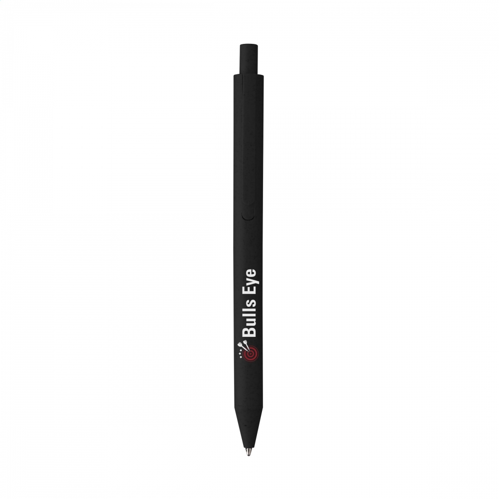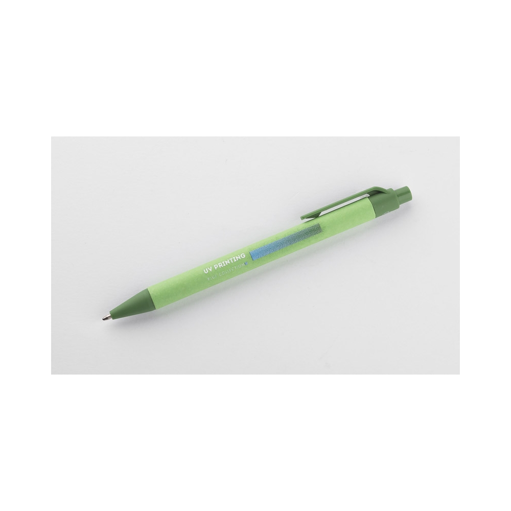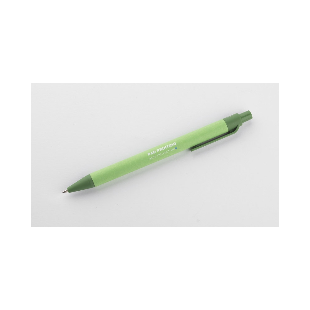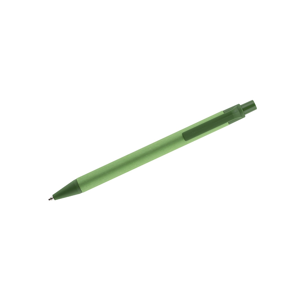 Kugelschreiber mit Druckknopfmechanismus. Kombination aus recyceltem Papierfass in Naturfarbe und Metallbeschlägen. Erhältlich in einer breiten Farbpalette, mit blauer Tinte