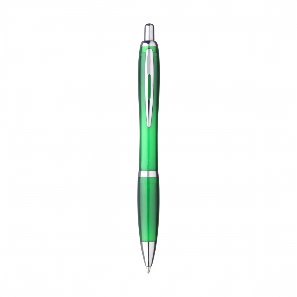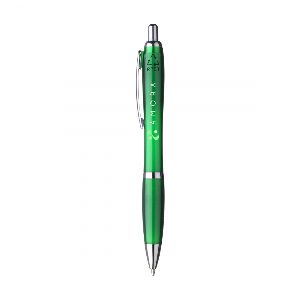 Der Nash Kugelschreiber besitzt ein elegantes, geschwungenes Design und einen weichen Griff. Er besteht aus recyceltem Kunststoff, der hart und stabil ist und dadurch eine lange Lebensdauer hat. Tintenfarbe: Blau. Schreiblänge: 1000 Meter. Schreibspitze: 1 mm.