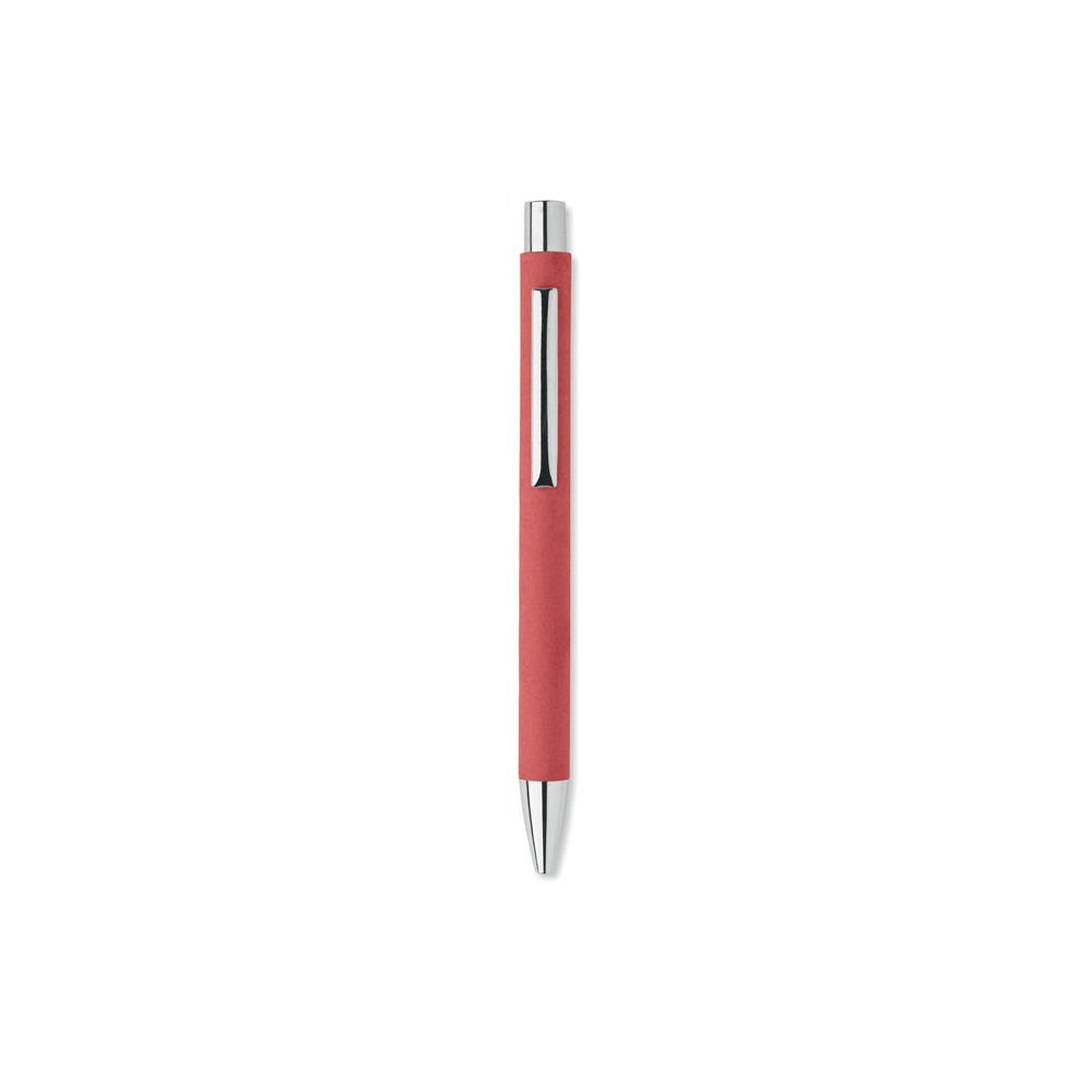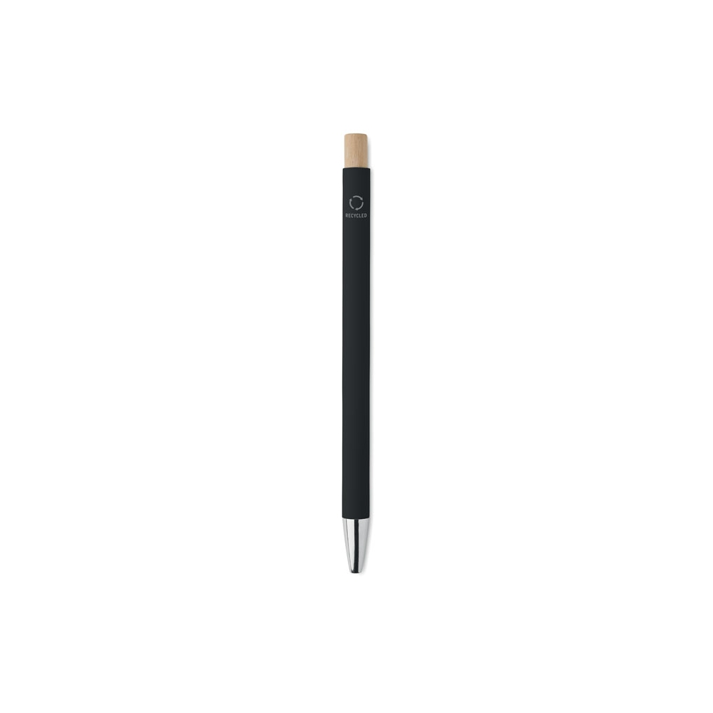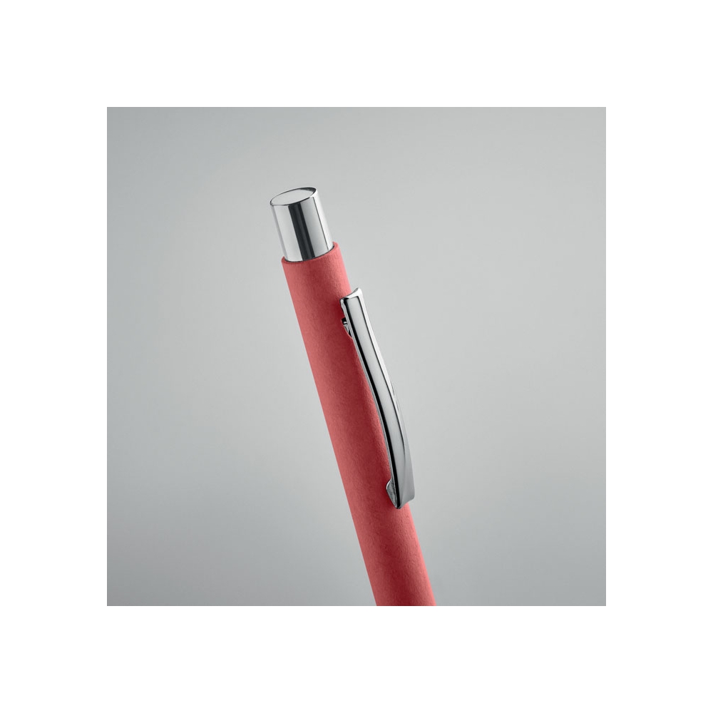 Stilvoller Druckkugelschreiber mit Schaft aus recyceltem Papier und silberglänzenden Metallbeschlägen. Blaue Tinte und in einer breiten Farbpalette erhältlich.