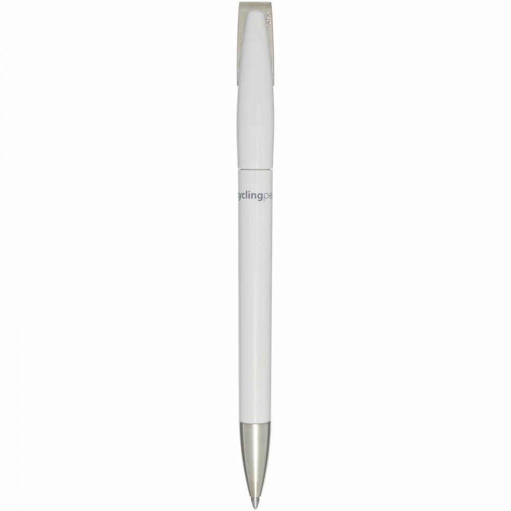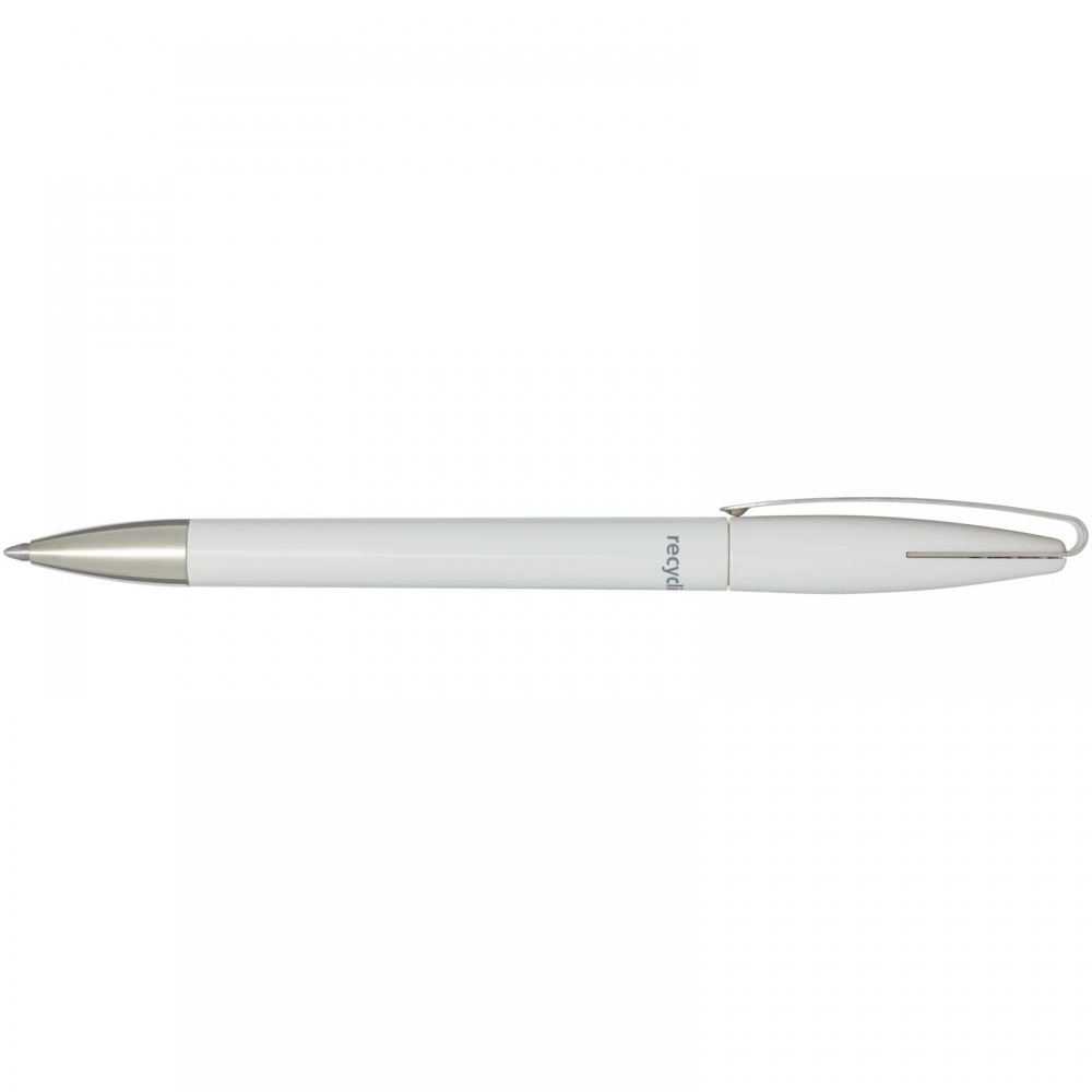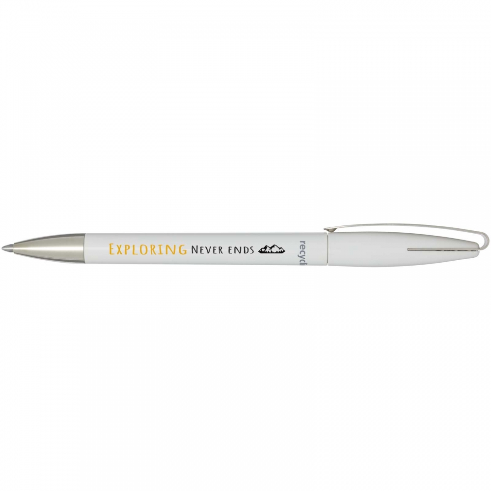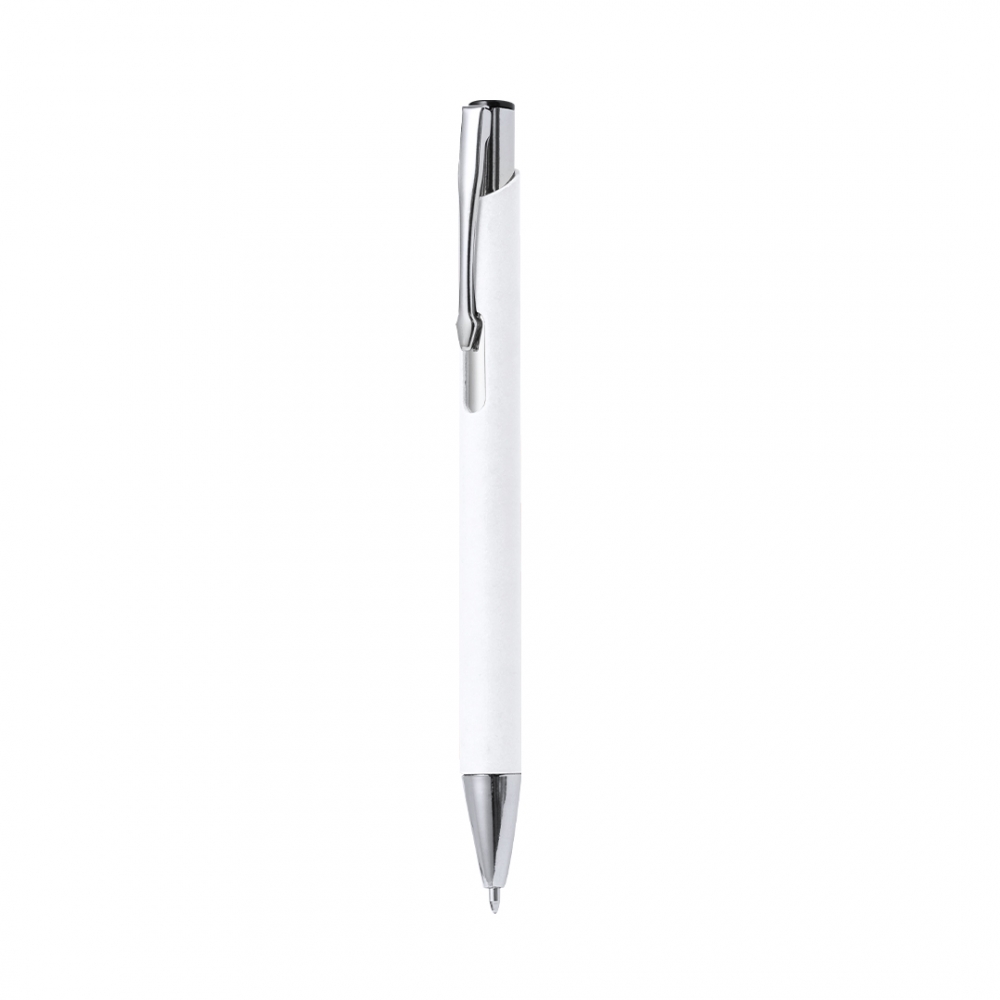 Stilvoller Druckkugelschreiber mit Schaft aus recyceltem Papier und silberglänzenden Metallbeschlägen. Blaue Tinte und in einer breiten Farbpalette erhältlich.