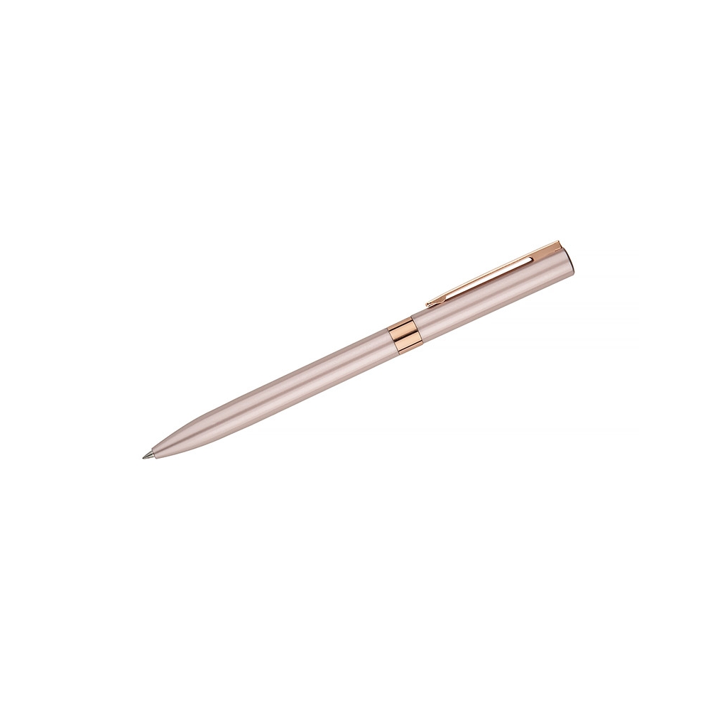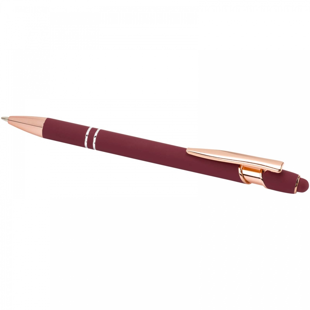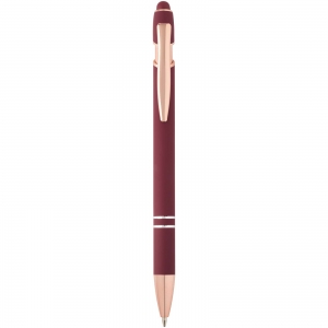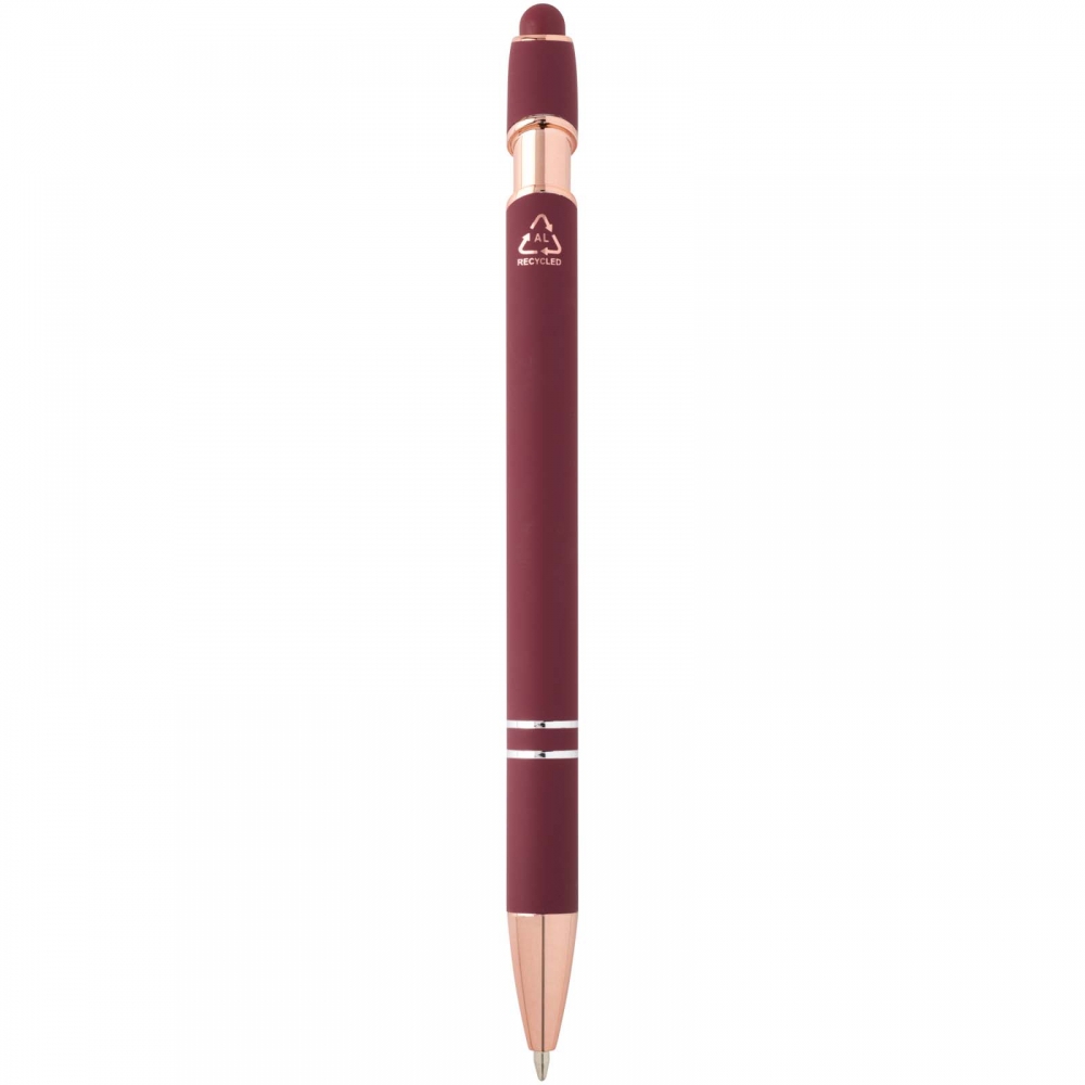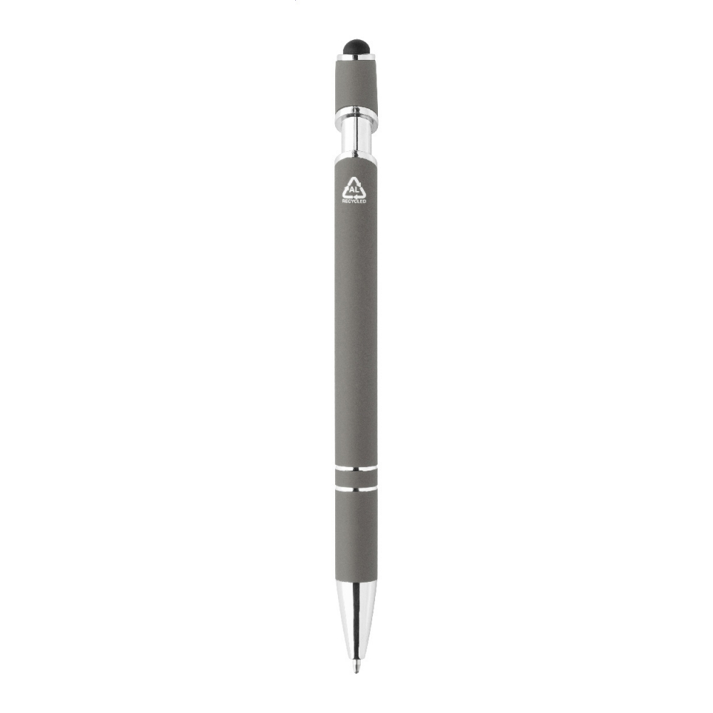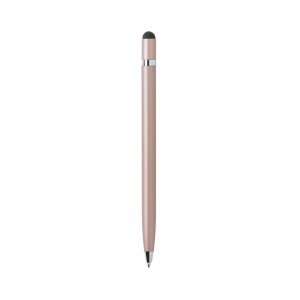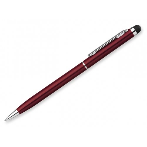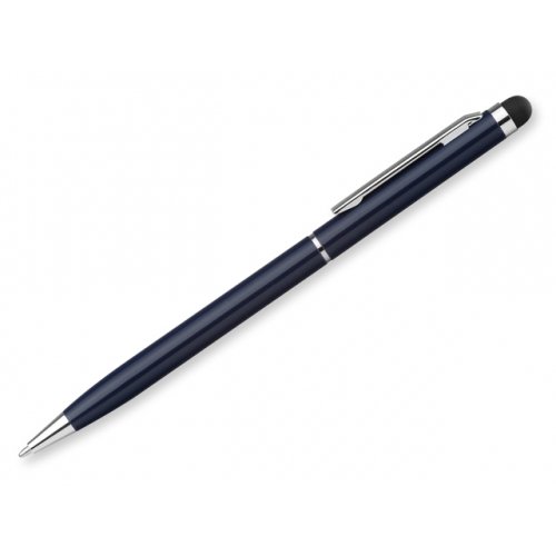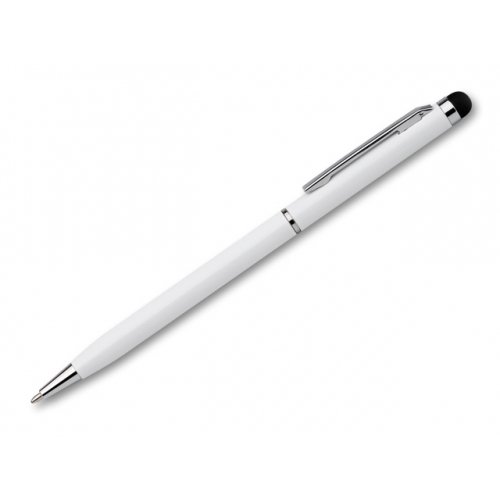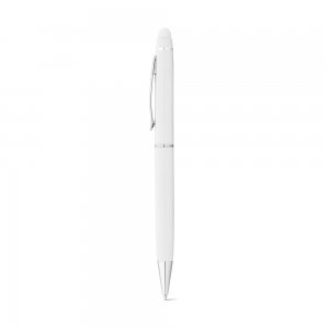 Dreh-Kugelschreiber mit Stylus aus Aluminium mit geschmeidigem Metallic-Finish und verchromtem Ring. Erhältlich in Gold, Rosa und Silber in glänzender Ausführung sowie Weiß in matter Ausführung. Blaue Tinte.