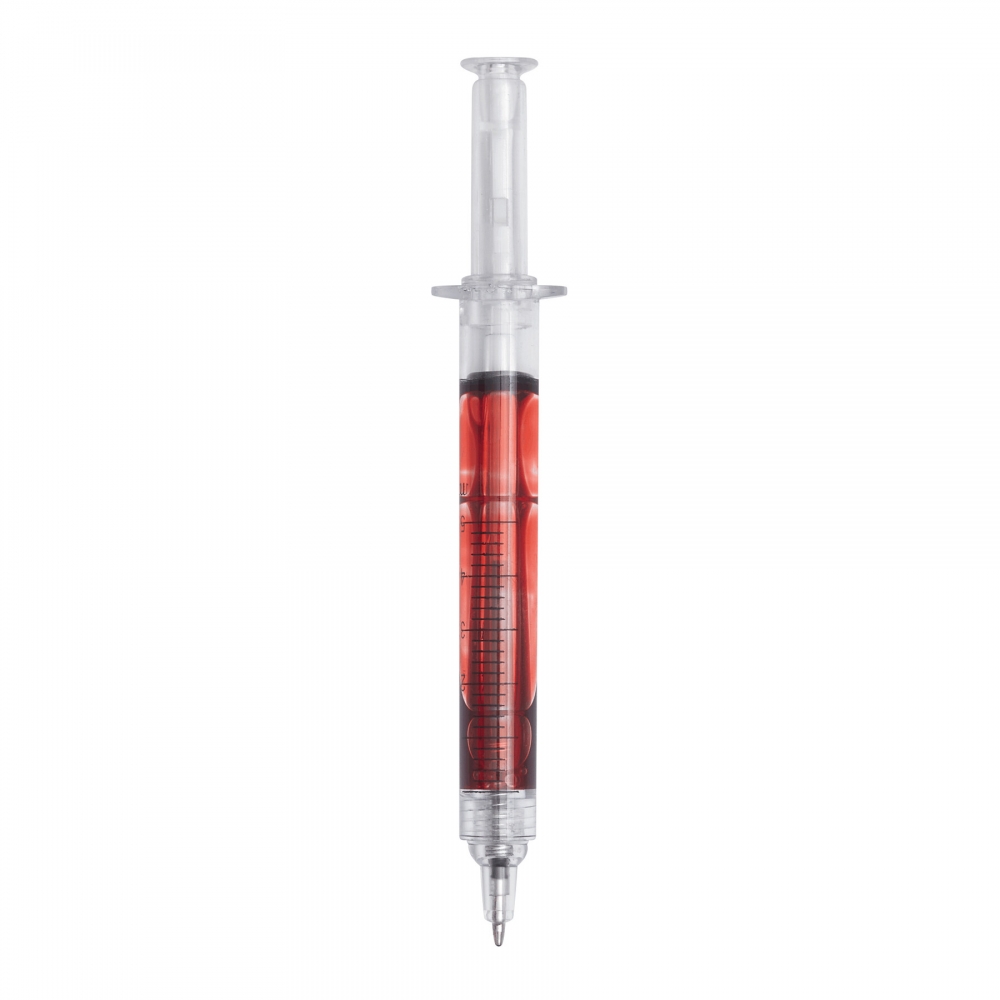 Kugelschreiber mit einer blau- bzw. rotschreibenden Mine passend zur Spritzenfarbe. Ihre Werbung drucken wir gegenüber der Skala am Schaft vorzugsweise in schwarz.