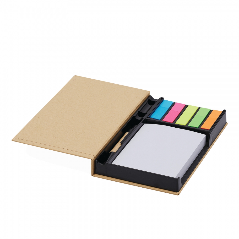 Memobox DRAWER: Abreißblock mit 120 Notizzetteln, 20 Büroklammern in verdeckter Schublade – befindet sich unter den 5 x 20 verschiedenfarbigen Markierflaggen – 1 Mini-Kugelschreiber (schwarzschreibend), Einband aus recycelbarer Pappe