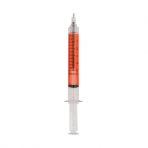 Kugelschreiber in Spritzenform mit flüssigkeitsgefülltem transparenten Gehäuse, blauschreibend.