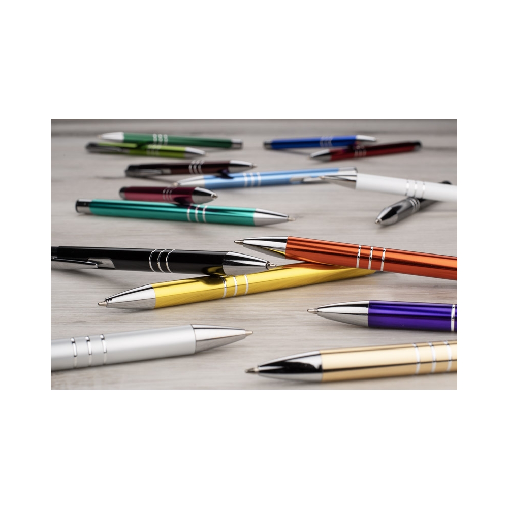 TOP PRICE! Farbig lackierter Kugelschreiber aus Aluminium mit 3 Zierringen und blauschreibender Großraummine. Die Werbung wird mittels Gravur rechts vom Clip angebracht.
