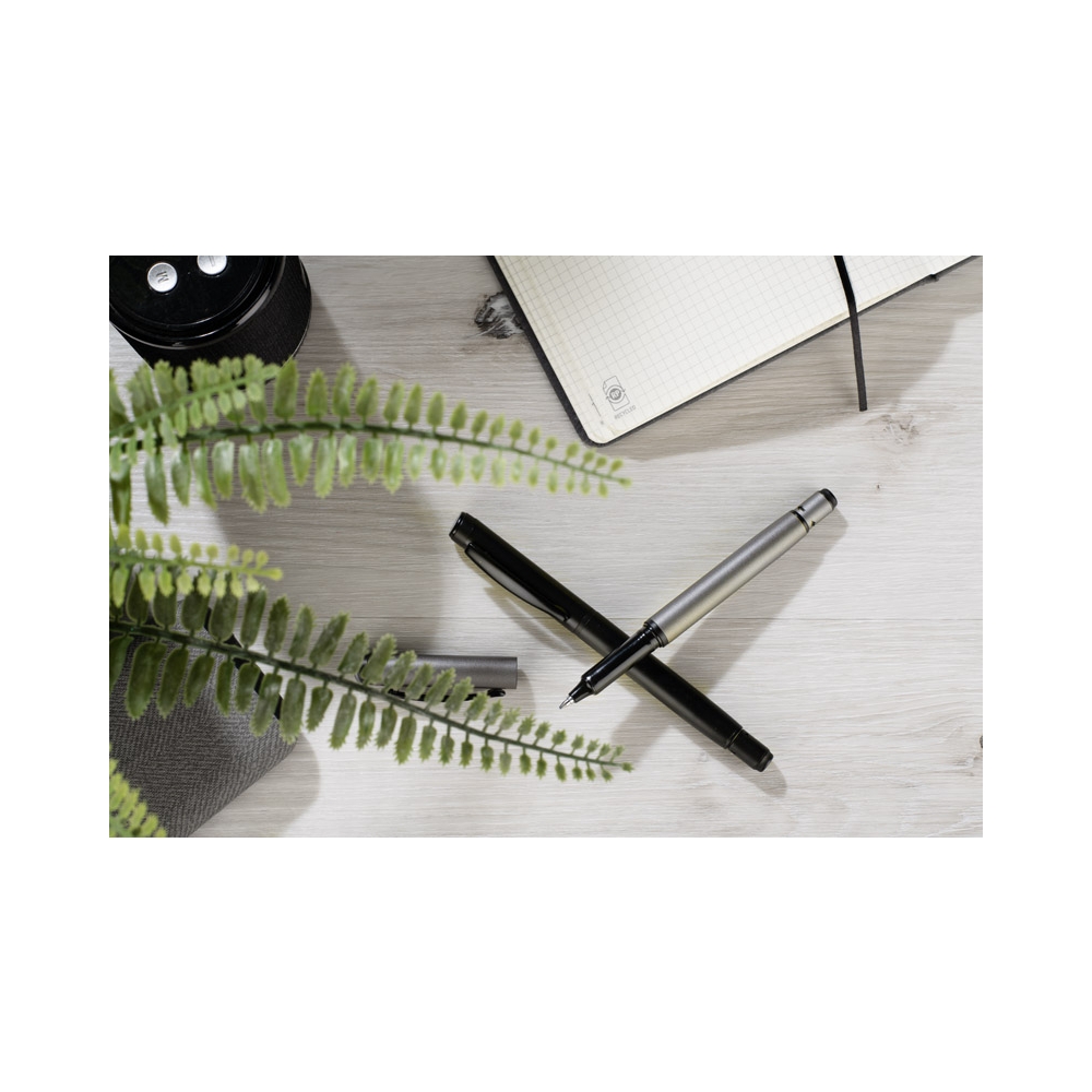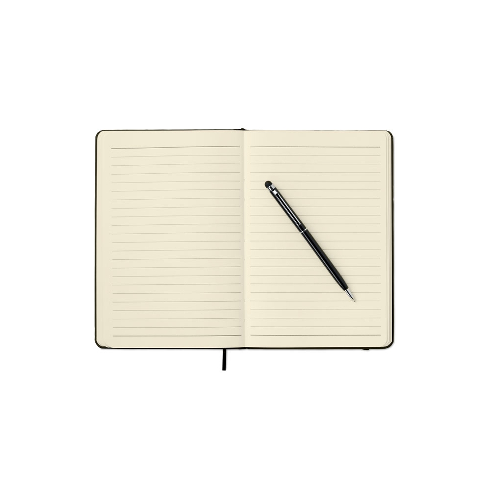 DIN A5 Notizbuch mit Hard Cover. 72 Blatt (144 Seiten) liniertes Papier. Farblich abgestimmter Kugelschreiber mit Stylus. Blaue Tinte. Elastisches Verschlussband, Lesebändchen und Stiftschlaufe. FSC MIX CREDIT | P7.1 | FSC-C213206