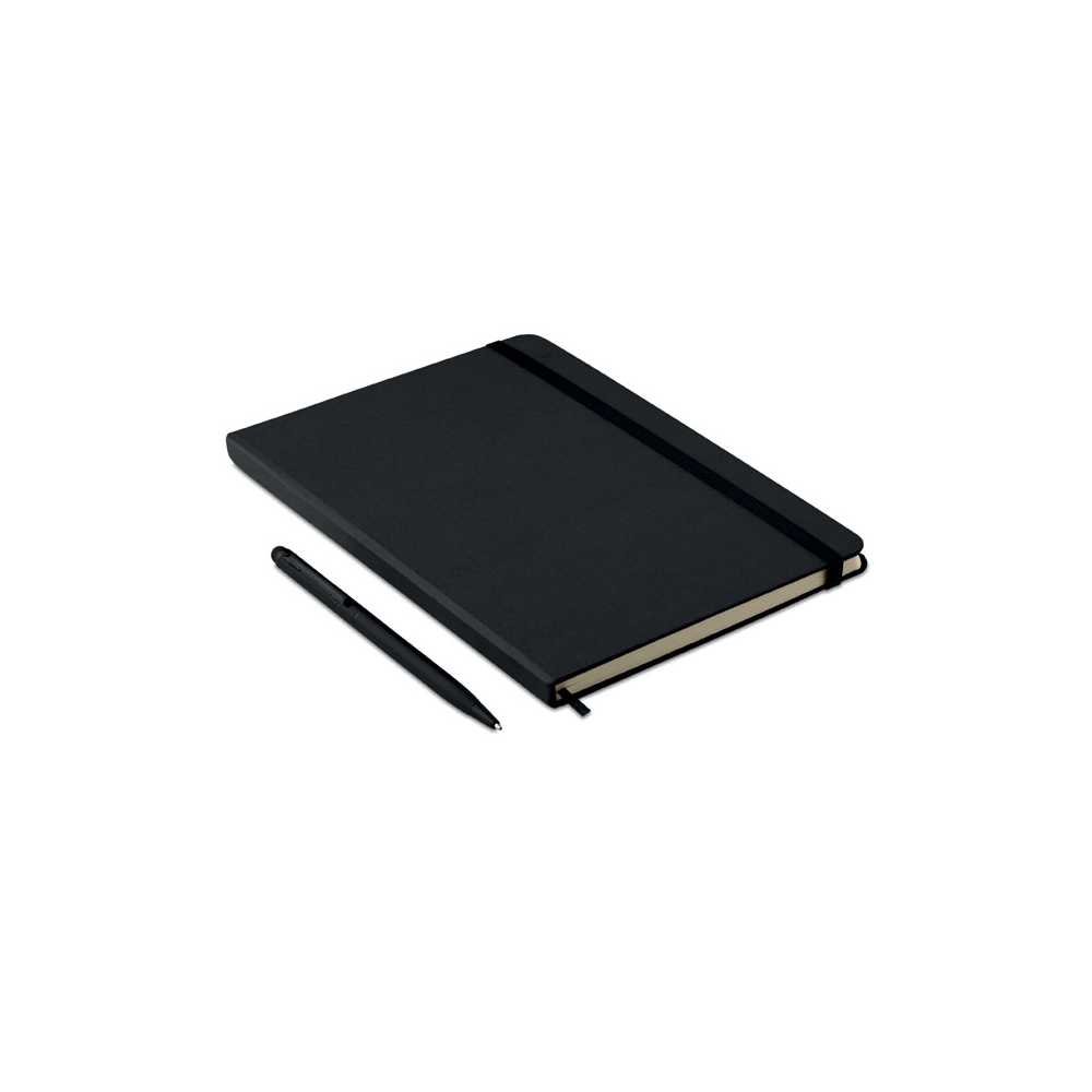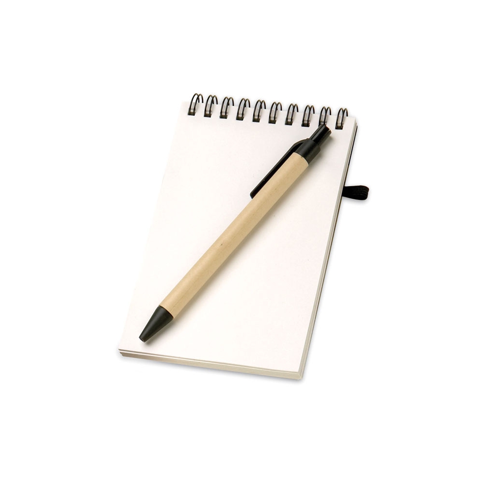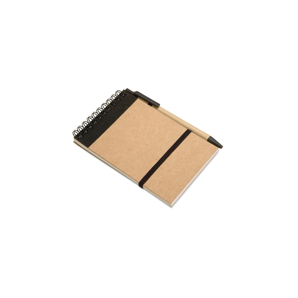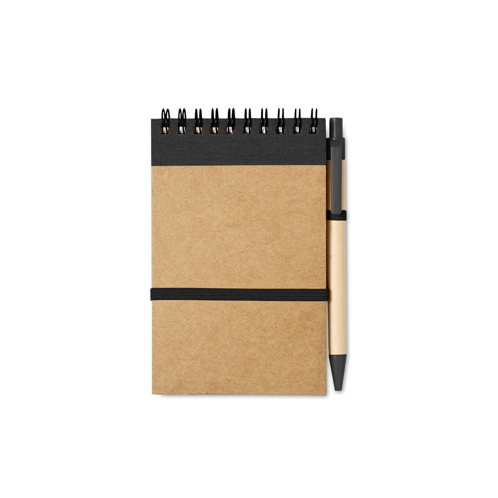 Notizbuch mit 70 Blatt (140 Seiten) recyceltem Blankopapier. Spiralbindung. Stiftschlaufe. Druckkugelschreiber aus recyceltem Karton mit Clip, Spitze und Drücker aus natürlich abbaubarem Kunststoff. Blaue Tinte. FSC®-certified | FSC MIX, P7.1, FSC-C213206