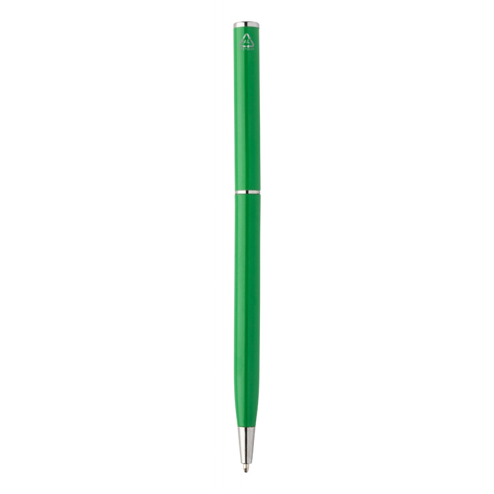 Stilvoller Kugelschreiber aus recyceltem Aluminium mit Druckknopfmechanismus. Robuster Schaft aus recyceltem Aluminium mit glänzender Oberfläche in verschiedenen Farben, mit blauer Tinte und mit Jumbo-Patrone. Metallclip und präsentiert in einer individuellen recycelten Tasche. Recyceltes Aluminium ist ein Material mit nahezu unbegrenzten Recyclingmöglichkeiten, das seine ursprünglichen Eigenschaften behält und bei diesem Prozess weniger Energie verbraucht. GRS-Zertifizierung (Global Recycled Standard), die die recycelte Herkunft des zur Herstellung des Produkts verwendeten Materials garantiert.