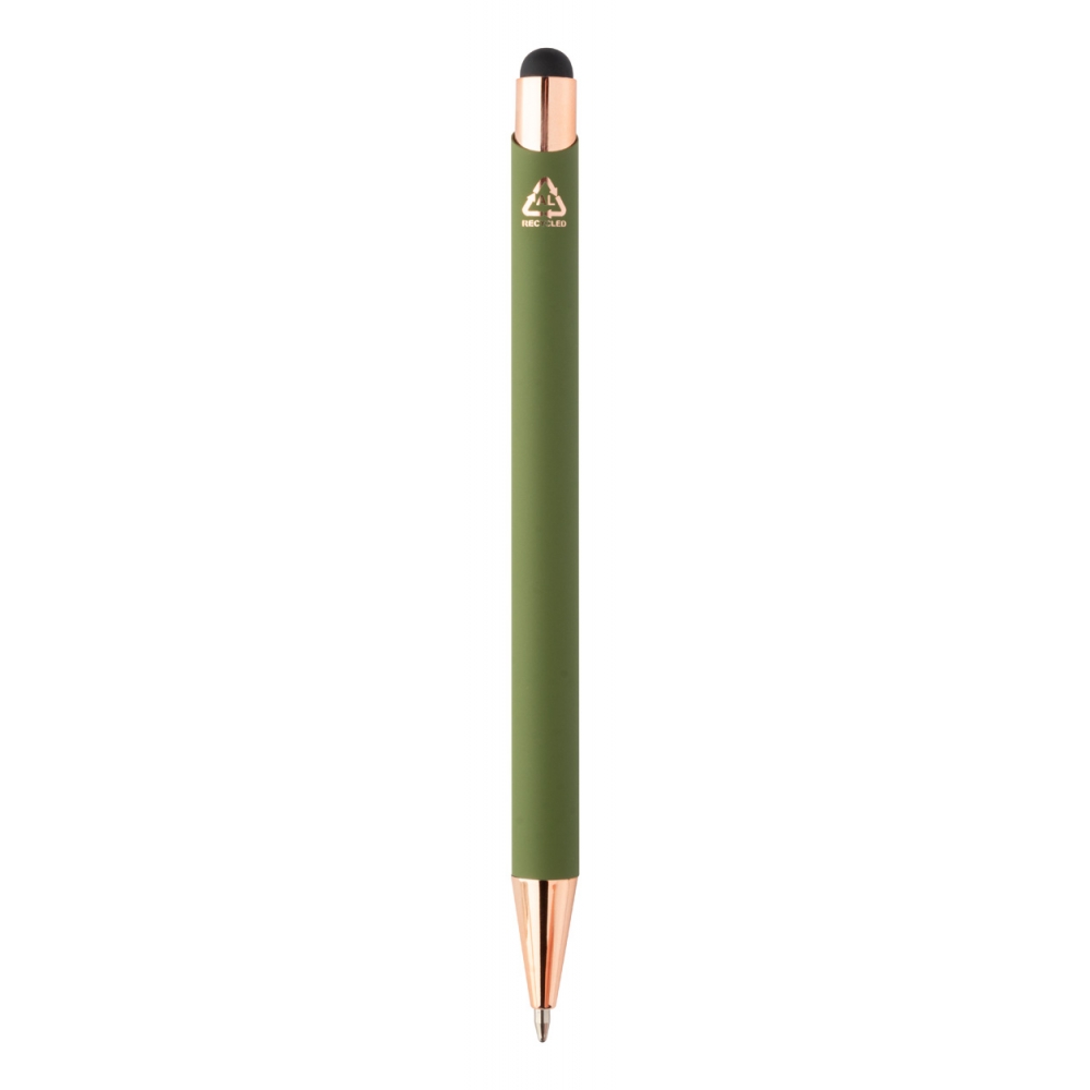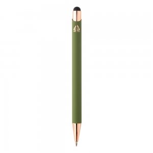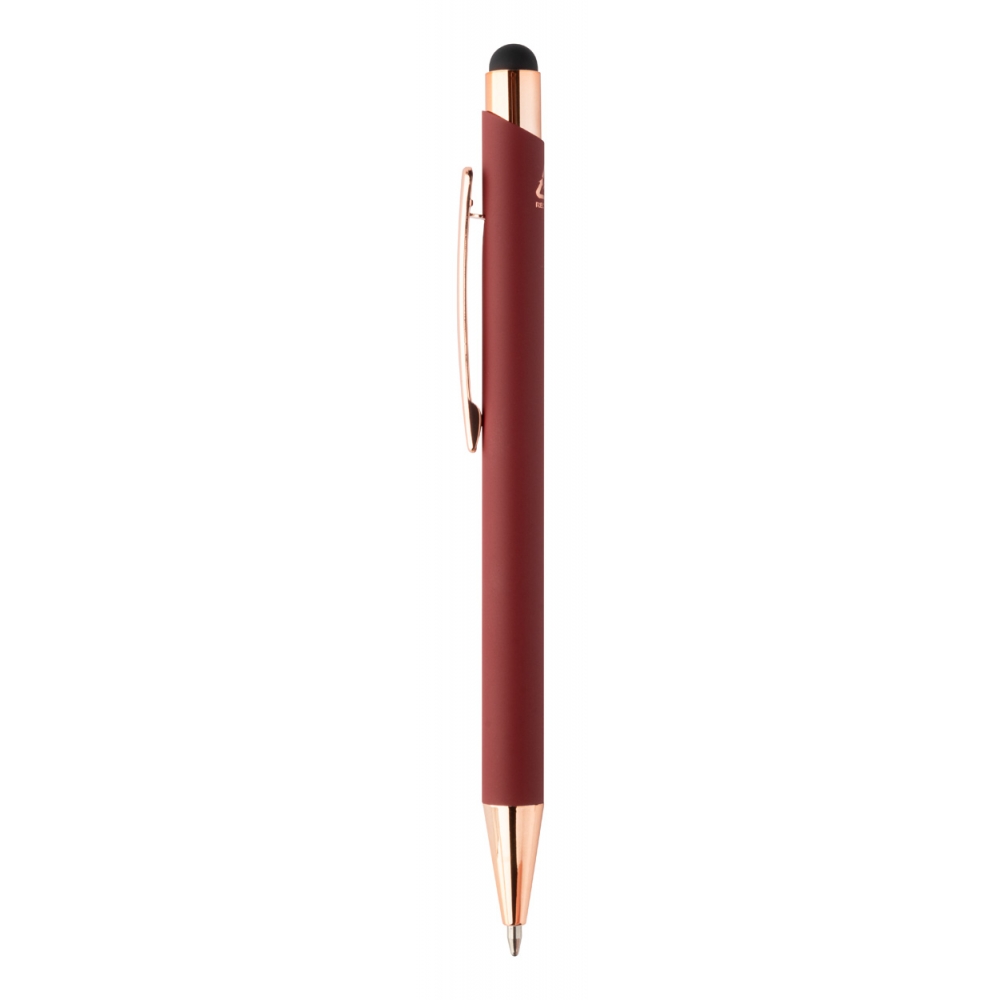 Kugelschreiber mit Touchpen aus recyceltem Aluminium mit gummierter Oberfläche und roségoldenen Elementen. Mit Spezialbeschichtung für Spiegelgravur in Roségold, blauschreibend.