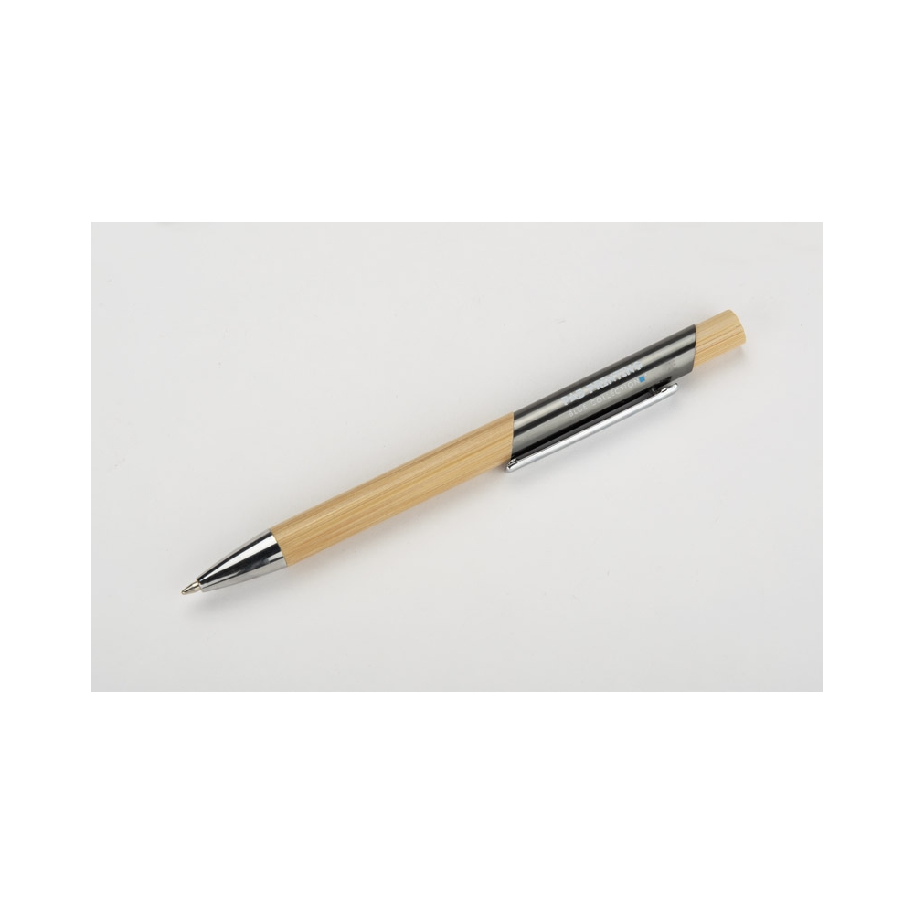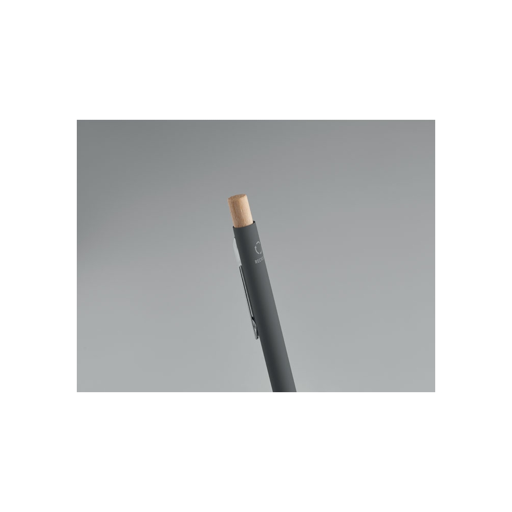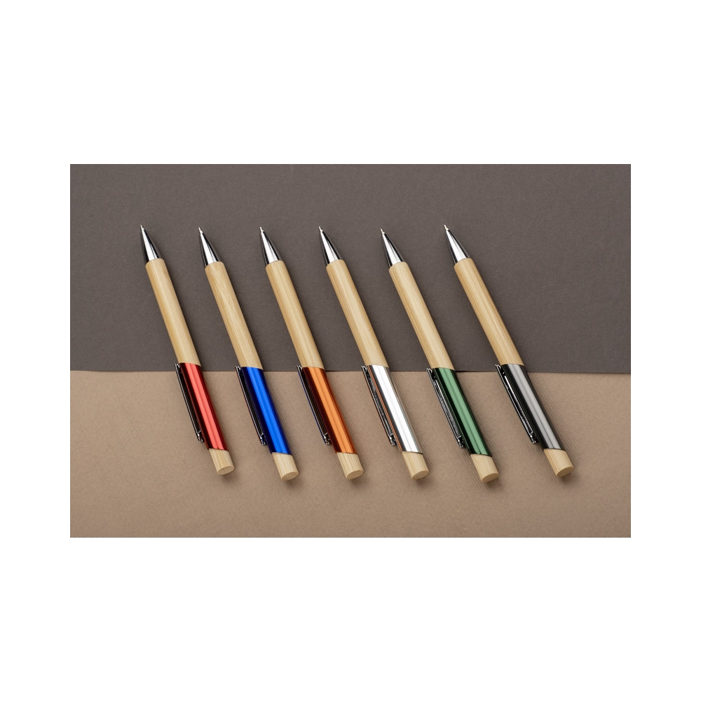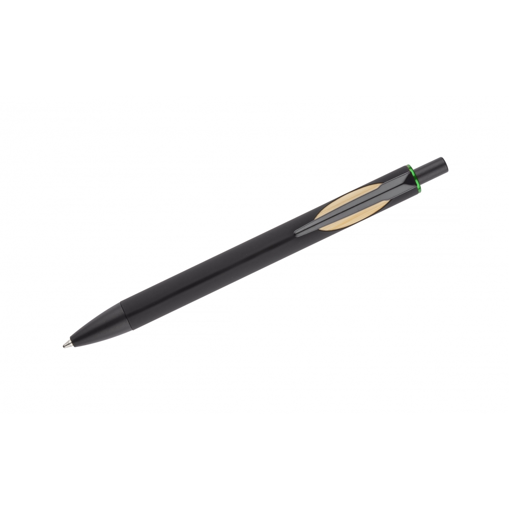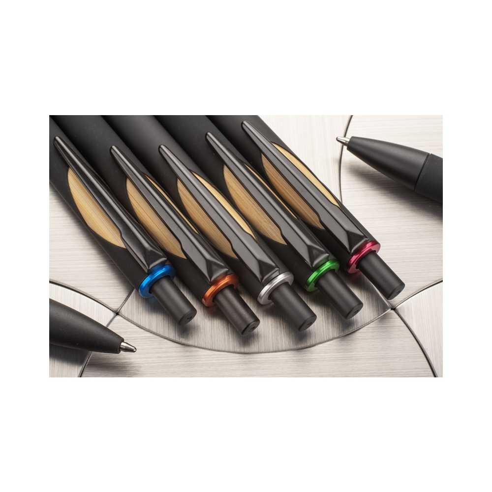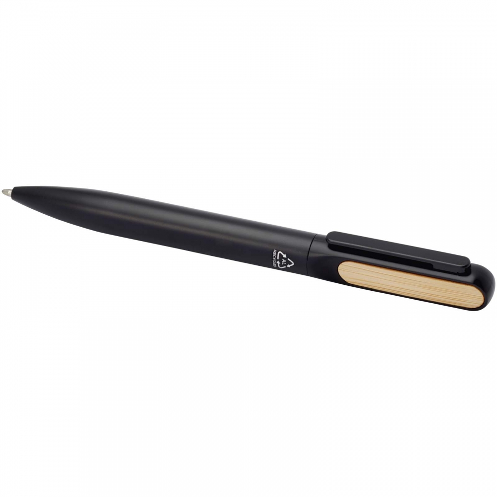 Artikel-Nr: MCM1524507Kugelschreiber aus recyceltem Aluminium mit schwarzem Metallclip, blau schreibender Mine, Bambusdrücker und 6-fach wechselndem Bambusfenster auf Höhe des Clips. Ihre Werbung gravieren wir neben dem Clip (Gravur auf die Bambusfläche auf Anfrage möglich).