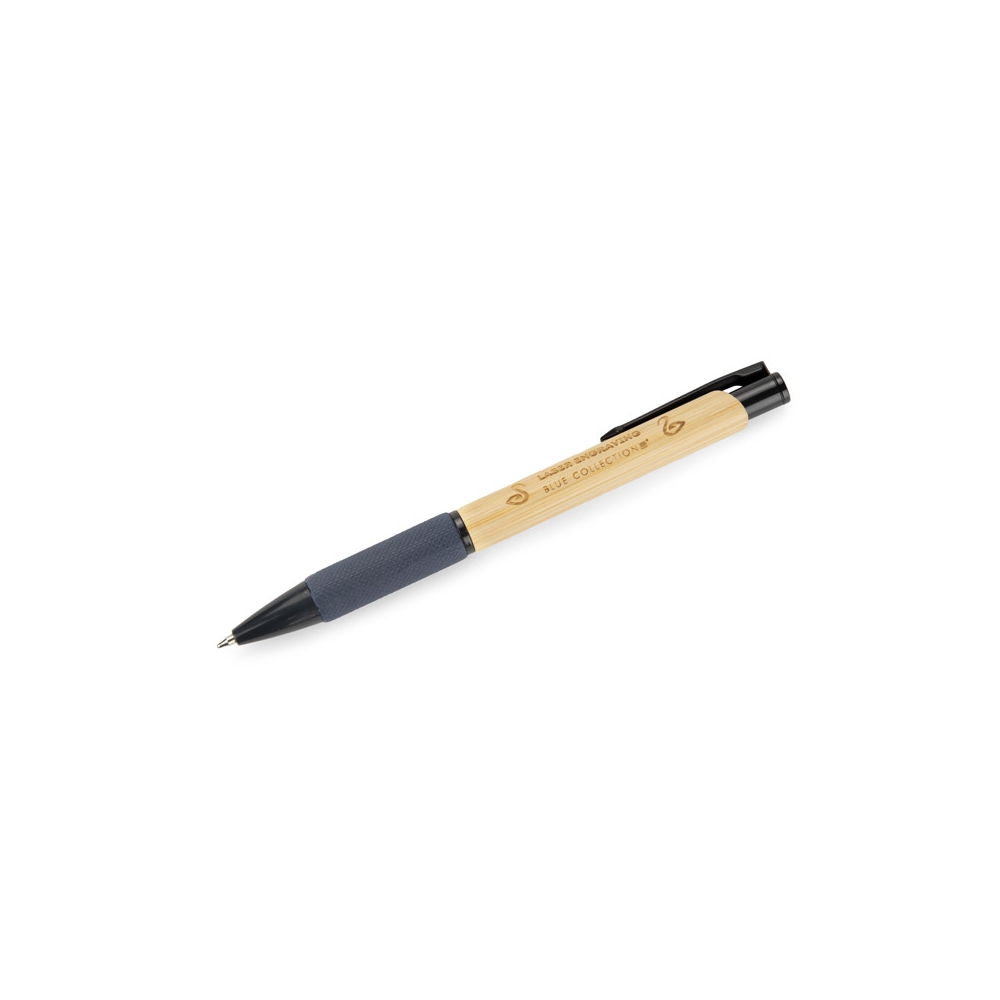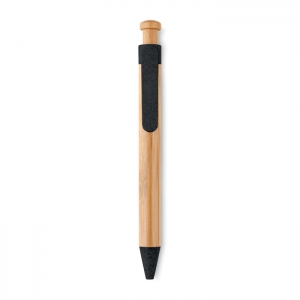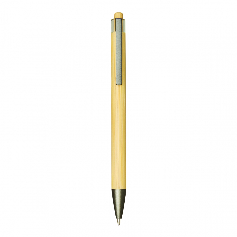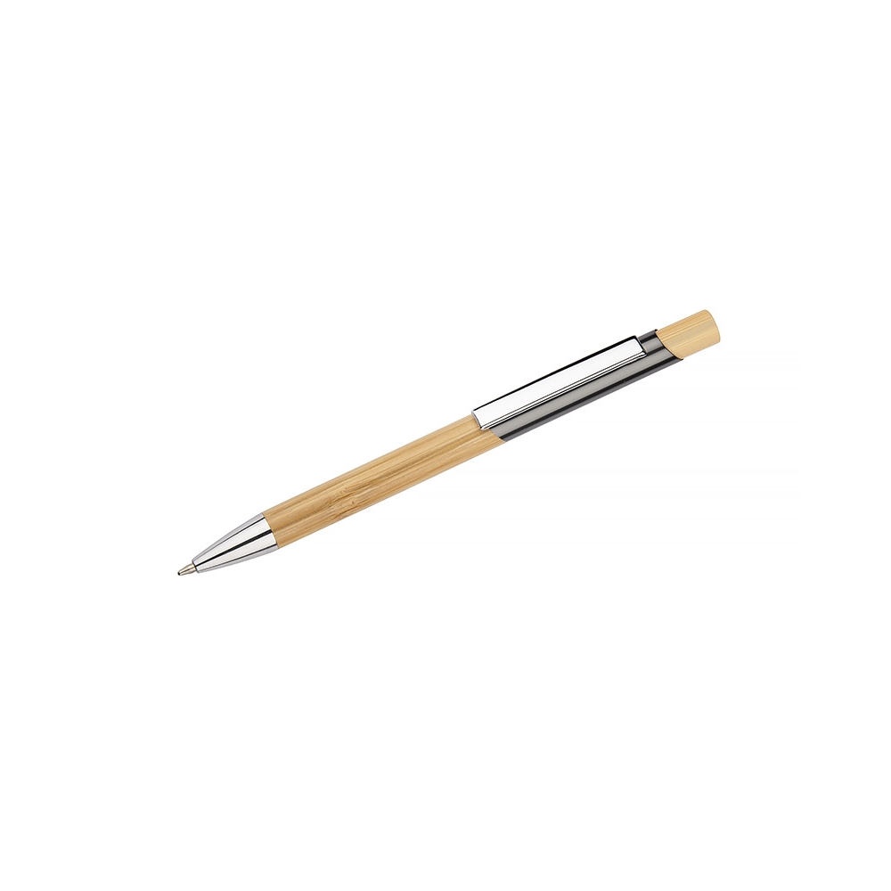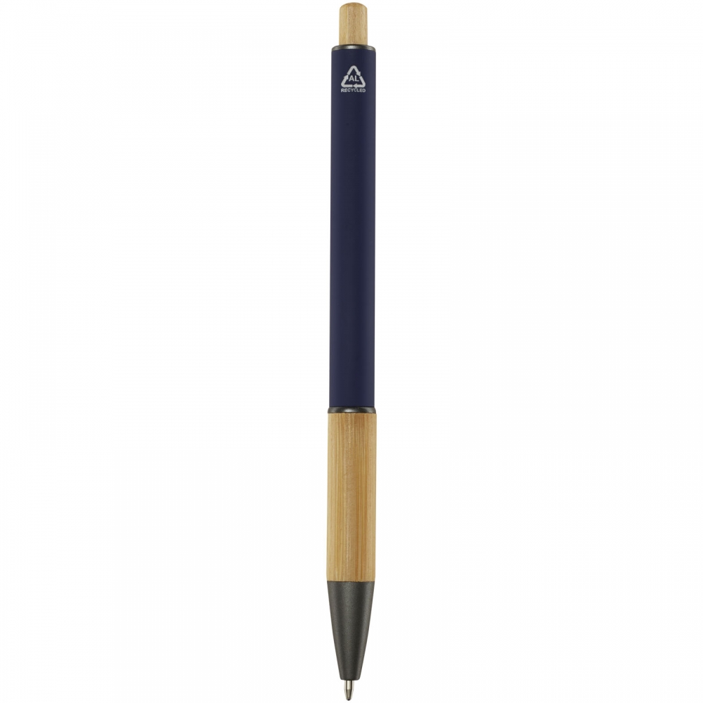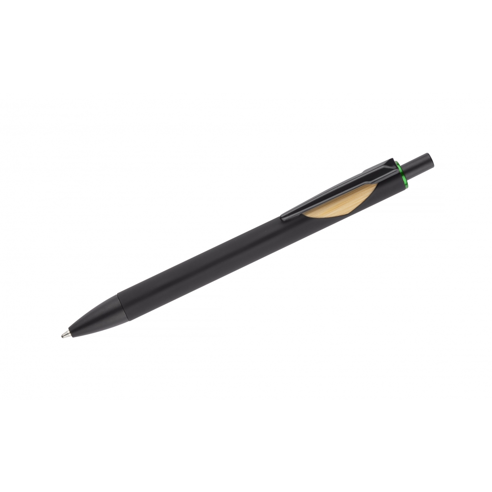 Artikel-Nr: MCM1524507Kugelschreiber aus recyceltem Aluminium mit schwarzem Metallclip, blau schreibender Mine, Bambusdrücker und 6-fach wechselndem Bambusfenster auf Höhe des Clips. Ihre Werbung gravieren wir neben dem Clip (Gravur auf die Bambusfläche auf Anfrage möglich).