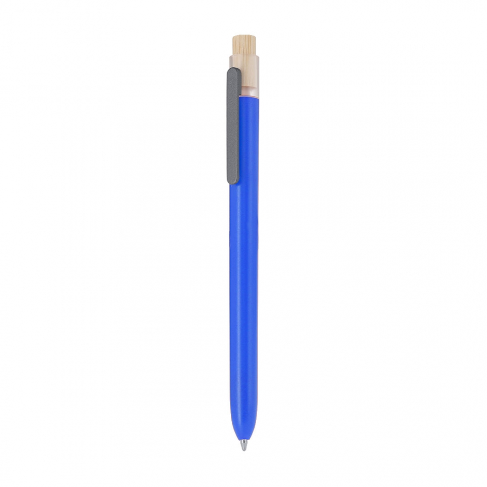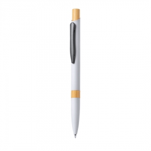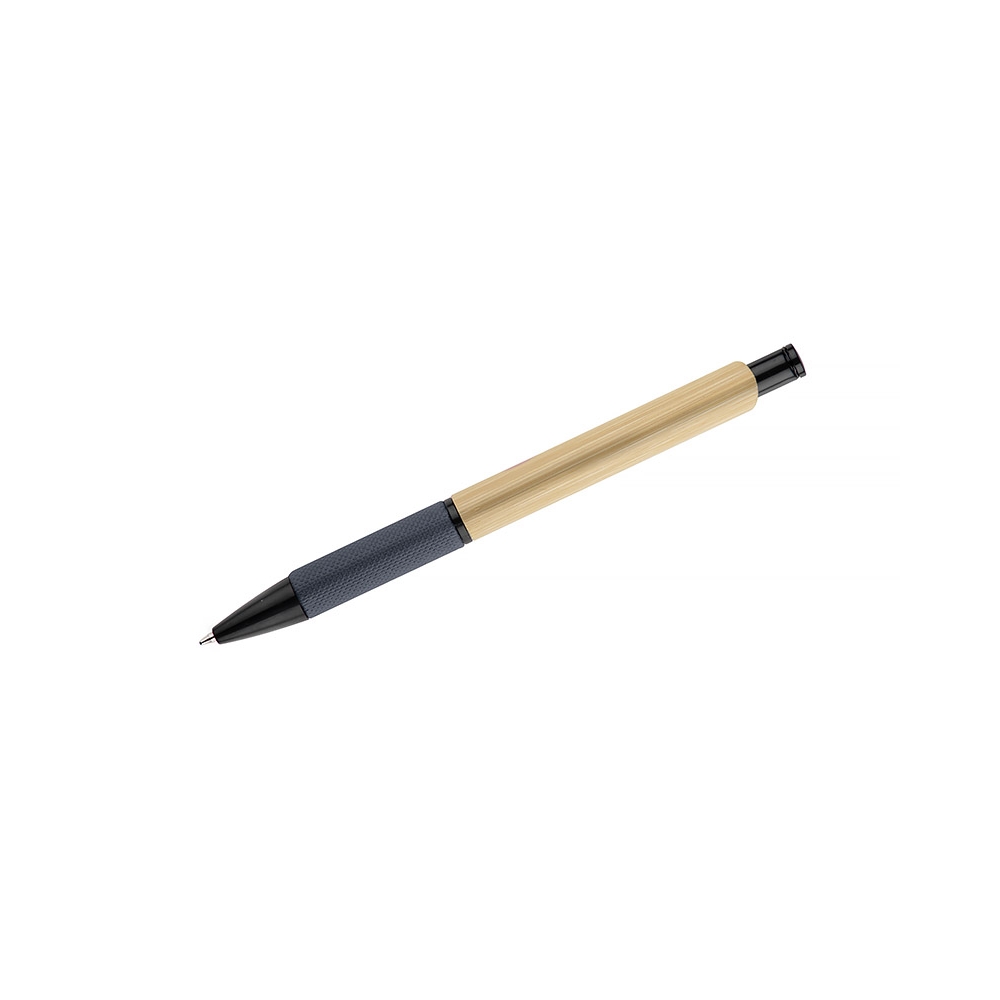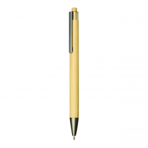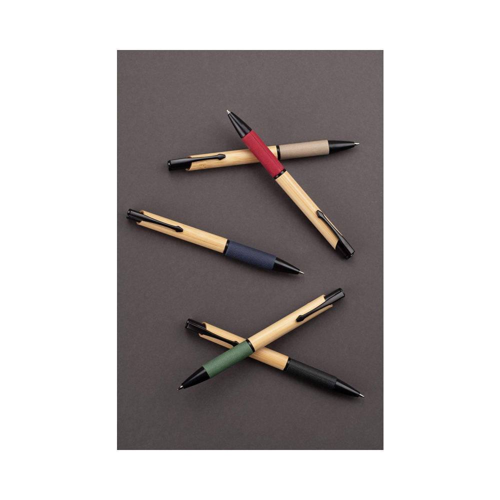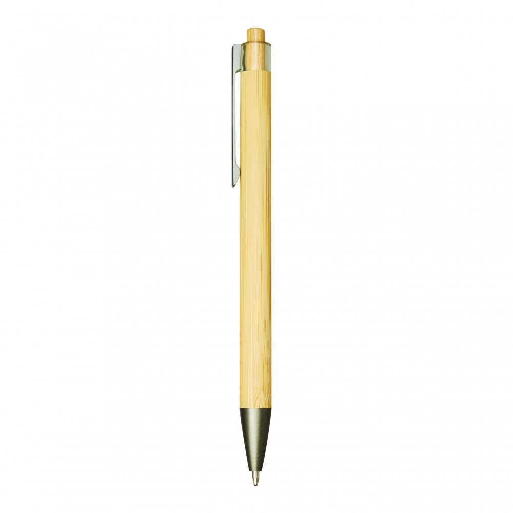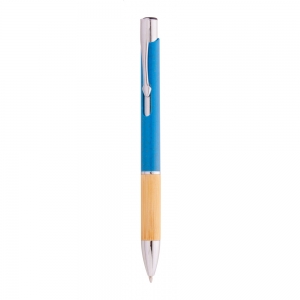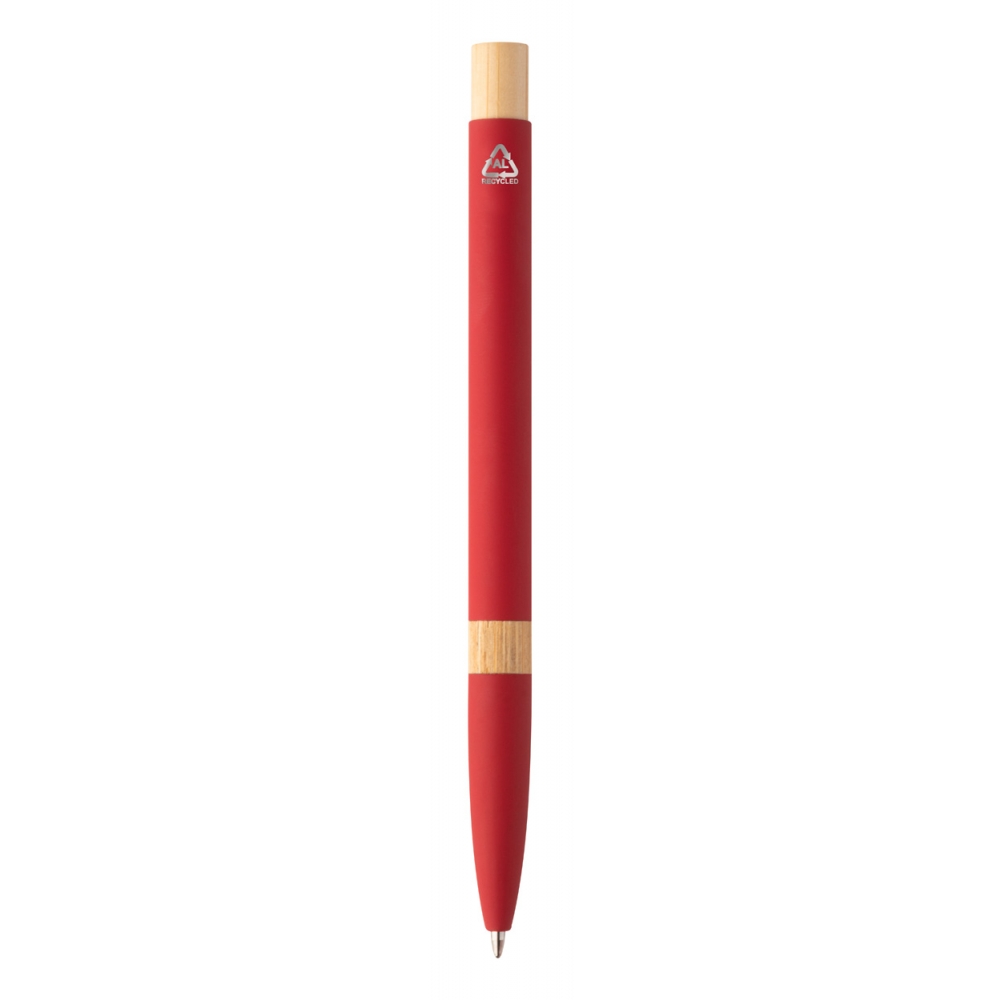 Artikel-Nr: MCM1524507Kugelschreiber aus recyceltem Aluminium mit schwarzem Metallclip, blau schreibender Mine, Bambusdrücker und 6-fach wechselndem Bambusfenster auf Höhe des Clips. Ihre Werbung gravieren wir neben dem Clip (Gravur auf die Bambusfläche auf Anfrage möglich).