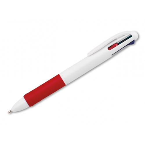 4-in-1 Multifunktions-Kugelschreiber mit Stylus am oberen Ende. Vier Tintenfarben. Farbiger Schaft, heller Ring und helle Spitze sowie schwarze Griffzone.