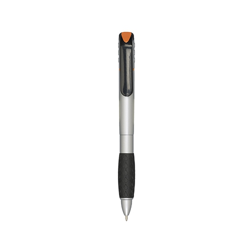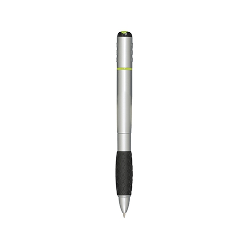 Multifunktions-Kugelschreiber mit Soft-Touch-Oberfläche und abgeflachtem, versenkbarem Clip sowie einem Stylus am oberen Ende für kapazitiveTouchscreen-Geräte. Chromfarbene Verzierung und Gummigriffzone.
