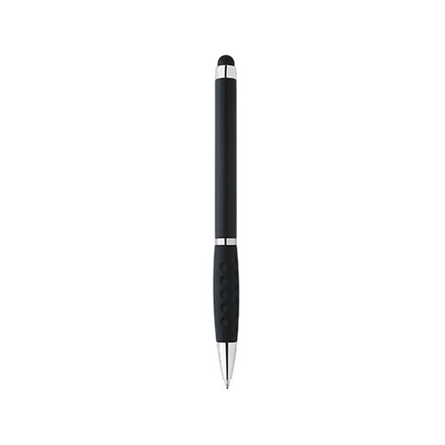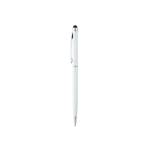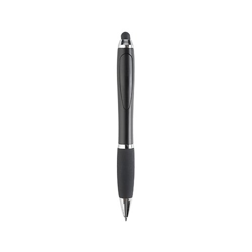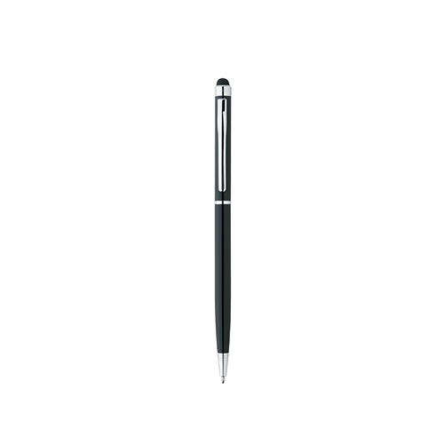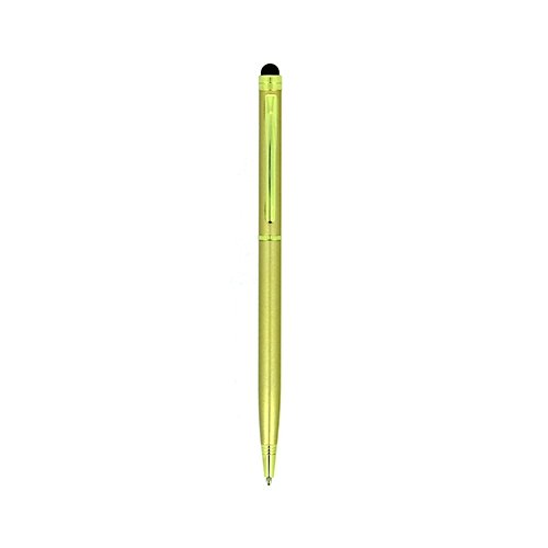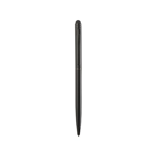 Multifunktions-Kugelschreiber mit schlankem Profil und Stylus am oberen Ende für kapazitive Touchscreen-Geräte. Gehäuse mit Glanzoberfläche und Metallverzierung.