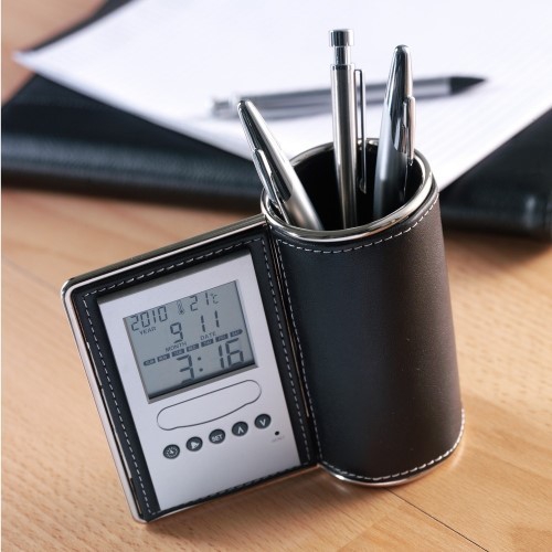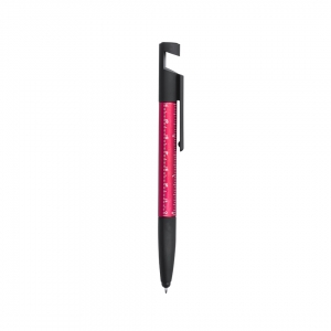 Multifunktioneller Druck-Kugelschreiber in kräftigen Farben mit speziellem Clip mit doppelter Funktion: Ständer für Mobilgeräte und Bildschirmreiniger. Mit Metallschaft - speziell entwickelt für den Tampondruck. Schwarze Tinte.