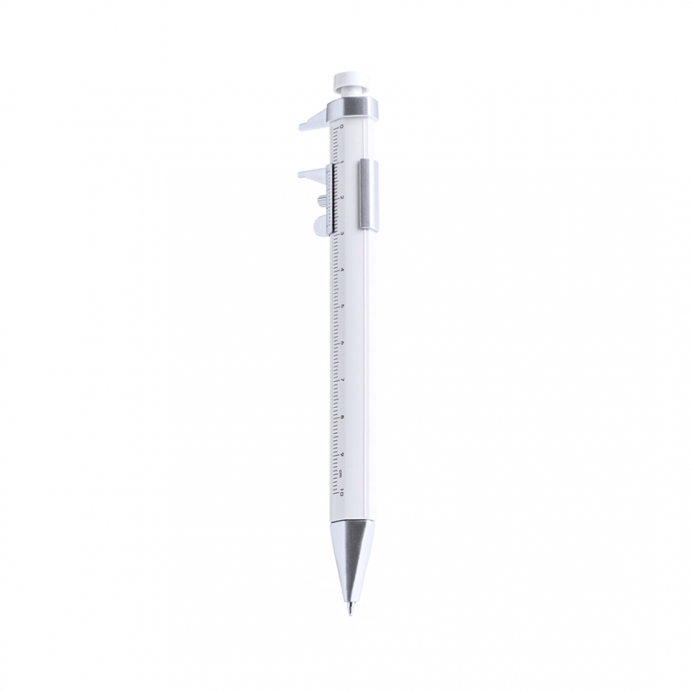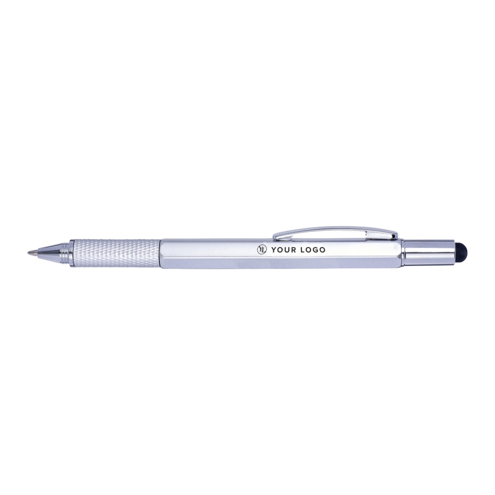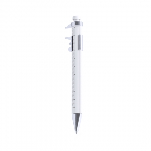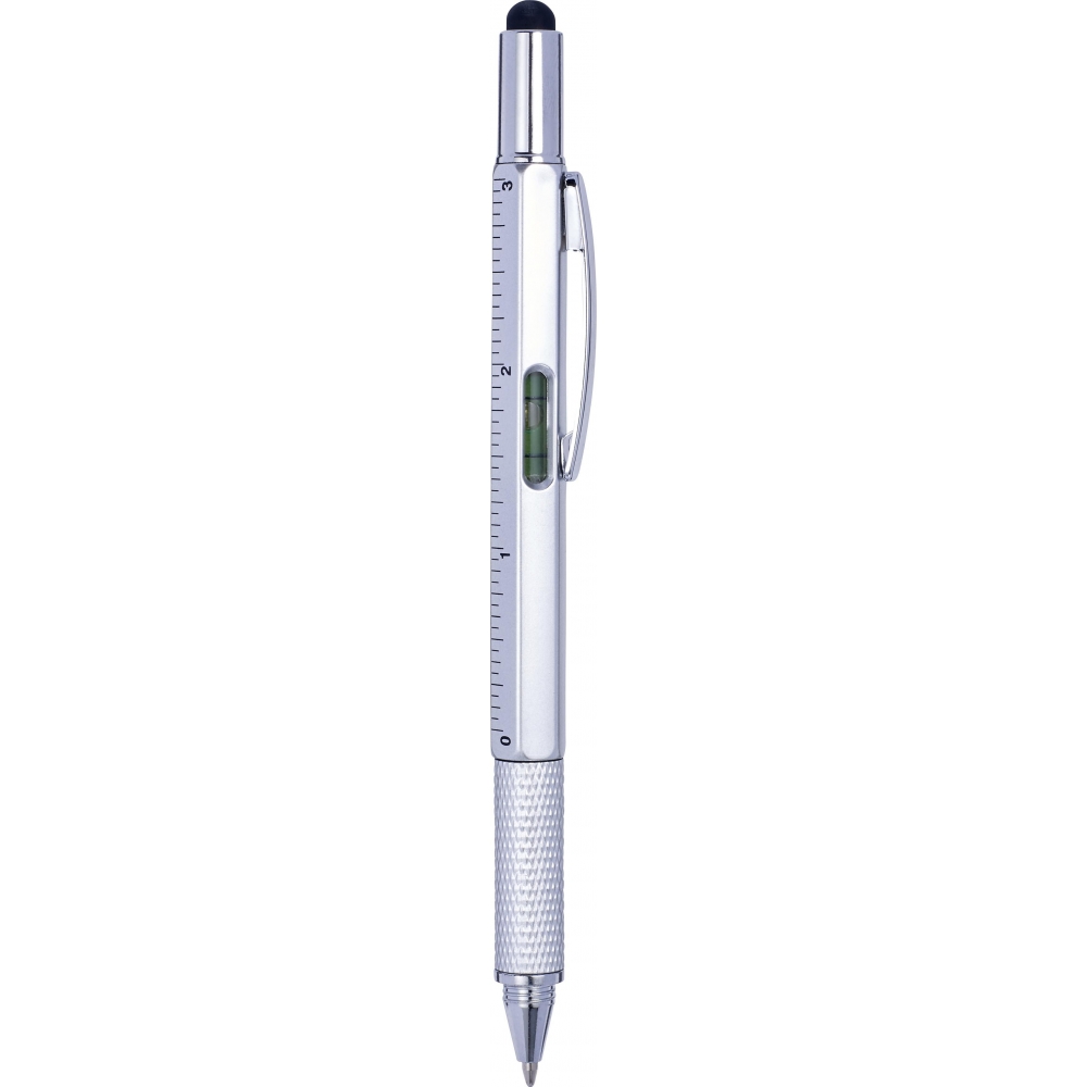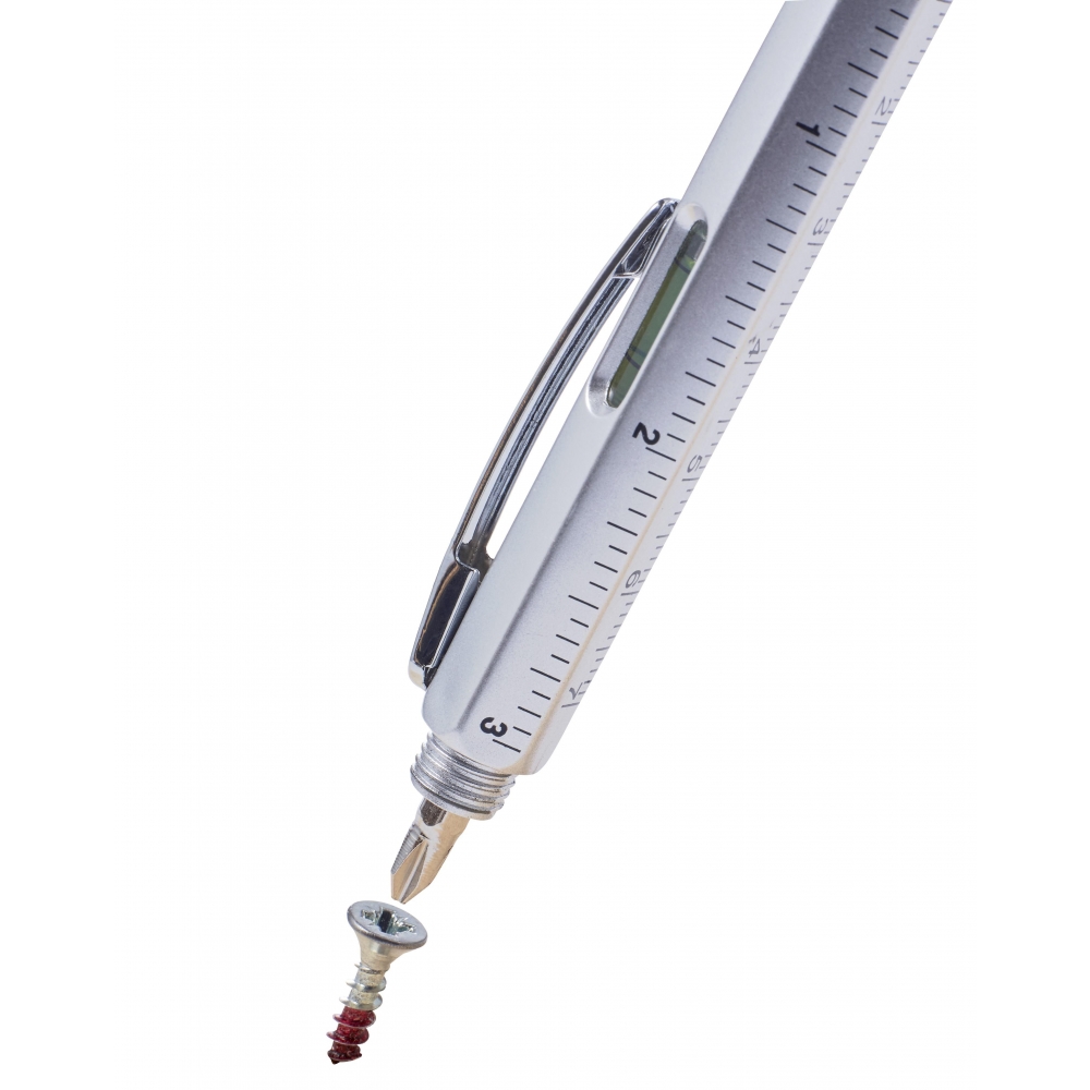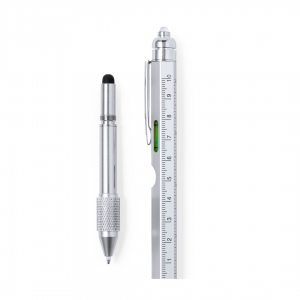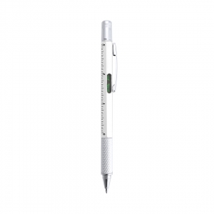 Multifunktionaler Kugelschreiber aus ABS mit Drehmechanik. Enthält eine Wasserwaage, ein Lineal und eine Gummispitze für kapazitive Bildschirme. Durch Drehen der Gummispitze kommt ein versteckter Schraubendreher zum Vorschein. Schwarze Tinte.