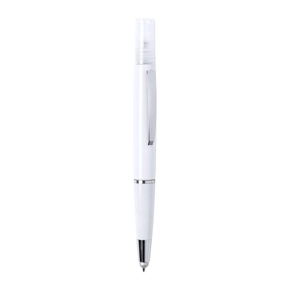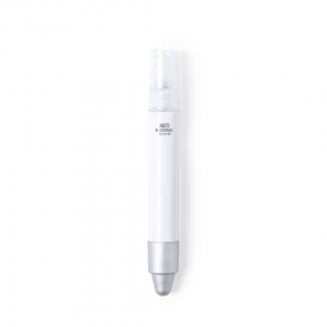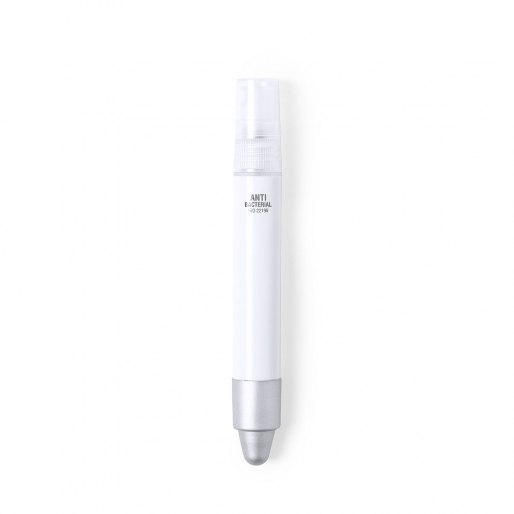 Antibakterieller Kugelschreiber mit integriertem nachfüllbarem Zerstäuber und Schutzkappe mit grauem Griffel. Glatte Oberfläche aus robustem, glänzendem ABS mit verchromten Beschlägen und blauer Tintenschrift. Kapazität des Zerstäubers 3ml. Flüssigkeit nicht enthalten. Produkte mit antibakteriellen Behandlungen sind in der Lage, die auf den Materialoberflächen vorhandenen bakteriellen Belastungen drastisch zu reduzieren, dank der Einbindung statischer, permanenter mikrobieller Wirkstoffe, mit hoher Wirksamkeit zur Hemmung und Verhinderung bakterieller Kontamination. Artikel nach der Norm ISO 22196, der die antibakteriell ...