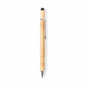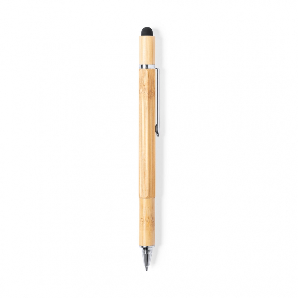 Praktischer 6in1 Multifunktionsstift aus Bambus mit den folgenden Features: Drehkugelschreiber mit schwarzschreibender Systemmine, Lineal, Wasserwaage, Schlitz- und Kreuzschraubenzieher sowie einem Touchpen. Ihre Werbung gravieren wir auf den Schaft.
