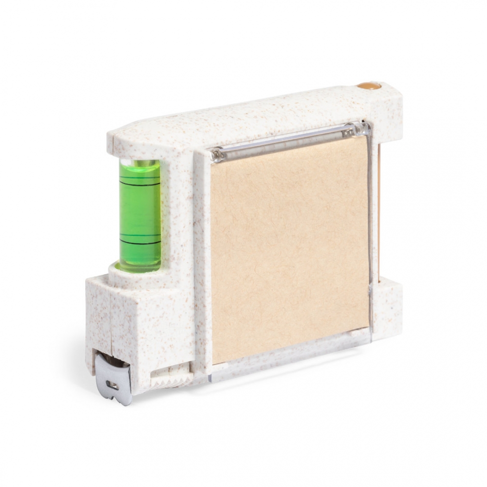 3-Meter-Multifunktions-Flexometer aus der Natur Linie, mit Gehäuse aus Weizenstroh. Mit integrierter Wasserwaage, Kugelschreiberhalter (inklusive Kugelschreiber) und Notizblock mit 12 Haftnotizen in Naturfarbe. Mit Schloss, Gürtelclip aus Metall und Skala mit Zentimeter- und Zollangaben. Präsentiert in einer individuellen Schachtel mit Kraftdesign. Weizenstroh fördert die Verwendung natürlicher Rohstoffe und reduziert die Schadstoffemissionen.