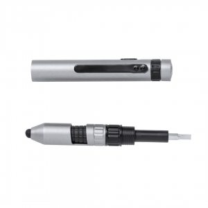 Multifunktionskugelschreiber aus Metall mit blauschreibender Mine und Clip. Dieser Kugelschreiber besteht aus einer Minitaschenlampe mit LED Licht, einem Laserpointer und hat eine Touchpen-Funktion. Enthält 3 LR41-Batterien. Geliefert in einem Geschenketui aus Metall. ø10 x 125 mm | Etui: 178 x 38 x 19 mm