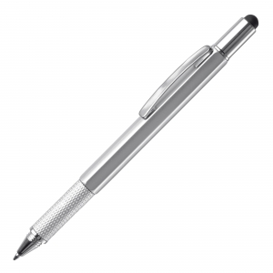 Drehkugelschreiber mit Stylus, aufgedrucktem Lineal und Mini-Wasserwaage (Gimmick), sowie integriertem Kreuz- und Schlitzschraubenzieher. Schwarze Tinte.