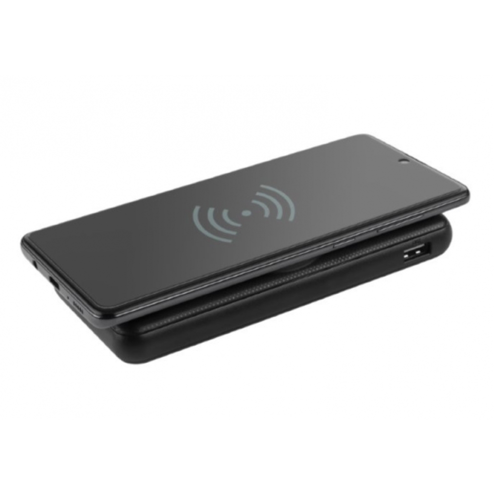 Flache kabellose Powerbank der Serie Blade mit einer gummierten Oberfläche. Die Saugnäpfe sorgen dafür, dass das Smartphone immer verbunden bleibt, auch wenn es mal in einer Tasche ist. Die Powerbank verfügt über USB-Anschlüsse mit denen auch Smartphones ohne Wireless-Charging-Funktion geladen werden können. Einzeln verpackt in einer Geschenkbox.