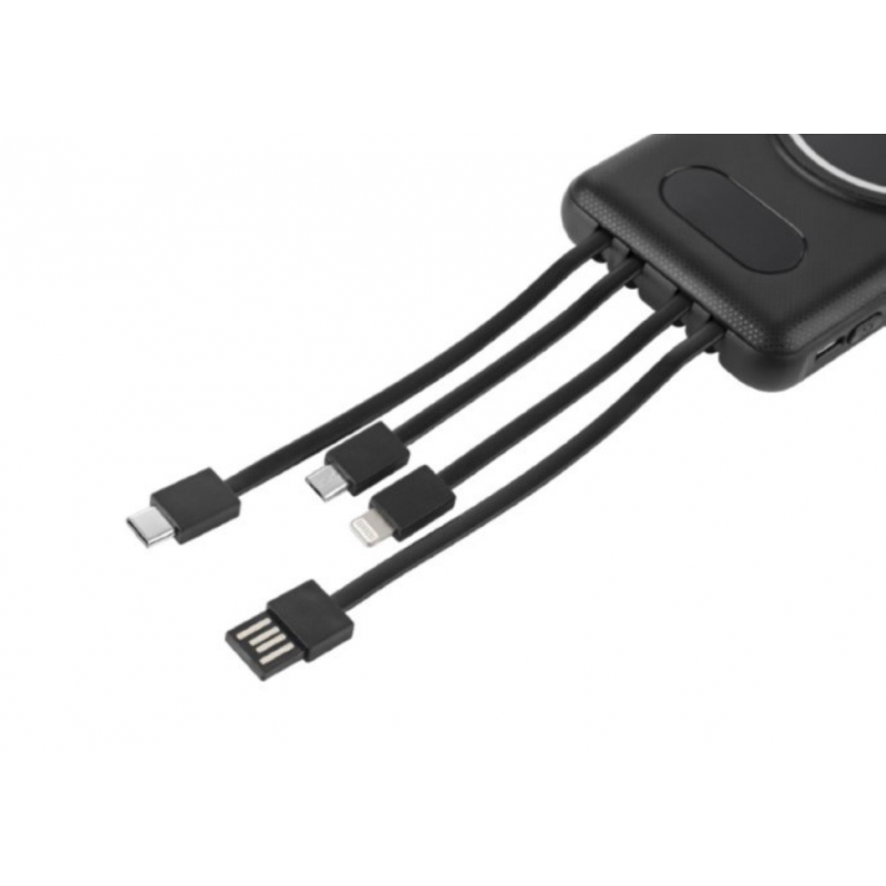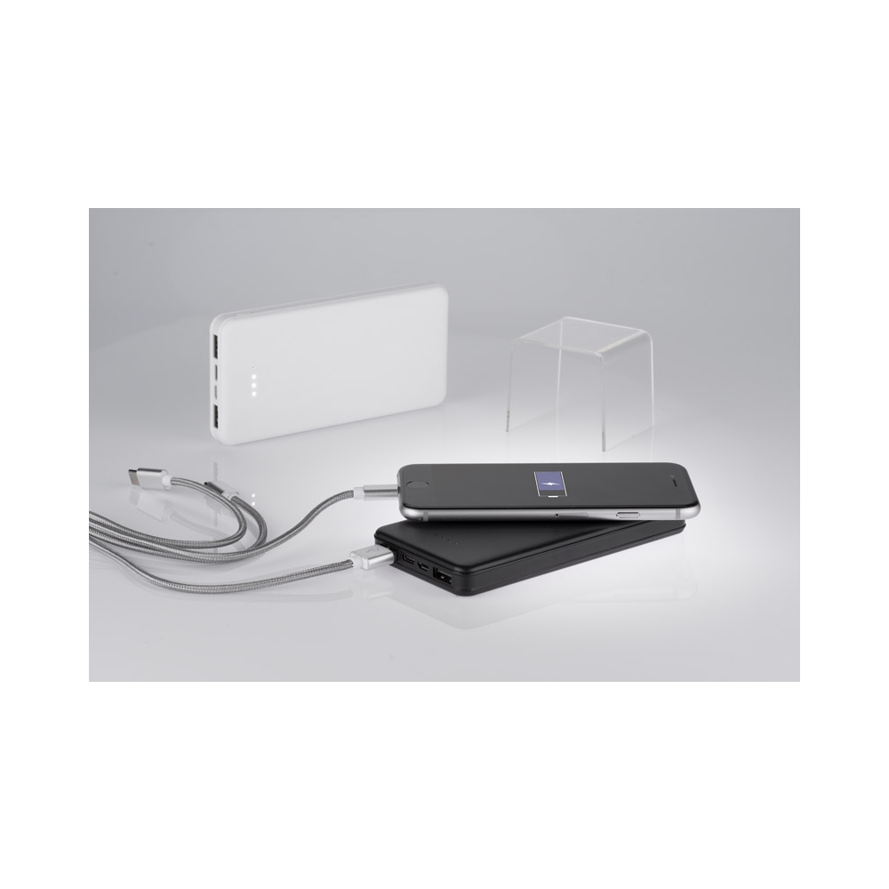 Kompakte und flache 5.000 mAh ABS-Powerbank, die durch Ihre 3 integrierten TPE-Kabel mit allen mobilen Geräten kompatibel ist. Die A-Grade Lithium Polymer Batterie kann voll geladen Ihr Smartphone bis zu 2 mal aufladen. Mit Ladestandsanzeige. Input: 5V/2A. Output: 5V/2A