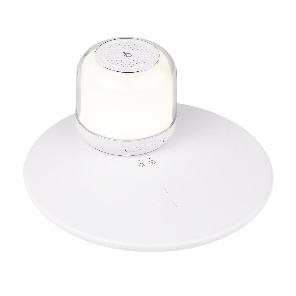 Tragbarer Lautsprecher aus Stoff und ABS mit gummierter Oberfläche, mit kabellosem Ladegerät auf der Oberseite. Mit kabelloser BT 5'0-Übertragung, 3.5-mm-Hilfseingang und kabellosem 5-W-Ladegerät. Mit einer Klangleistung von 3 W und einem 300-mAh-Akku hat er eine ungefähre Akkulaufzeit von 2 Stunden. Kompatibel mit mobilen Geräten mit kabelloser Ladetechnik. Enthält ein microUSB-Ladekabel. Wird in einer Geschenkbox geliefert. 108 x 56 x 54 mm