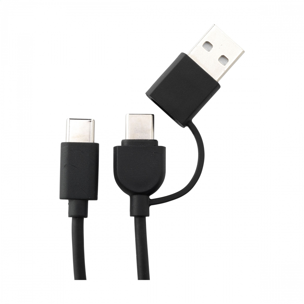 Ladekabel mit zwei Micro-USB / Lightning- und Typ-C-Anschlüssen (Eingang und Ausgang). Aluminiumanschlüsse und Metallplakette speziell für die Lasergravur entwickelt.