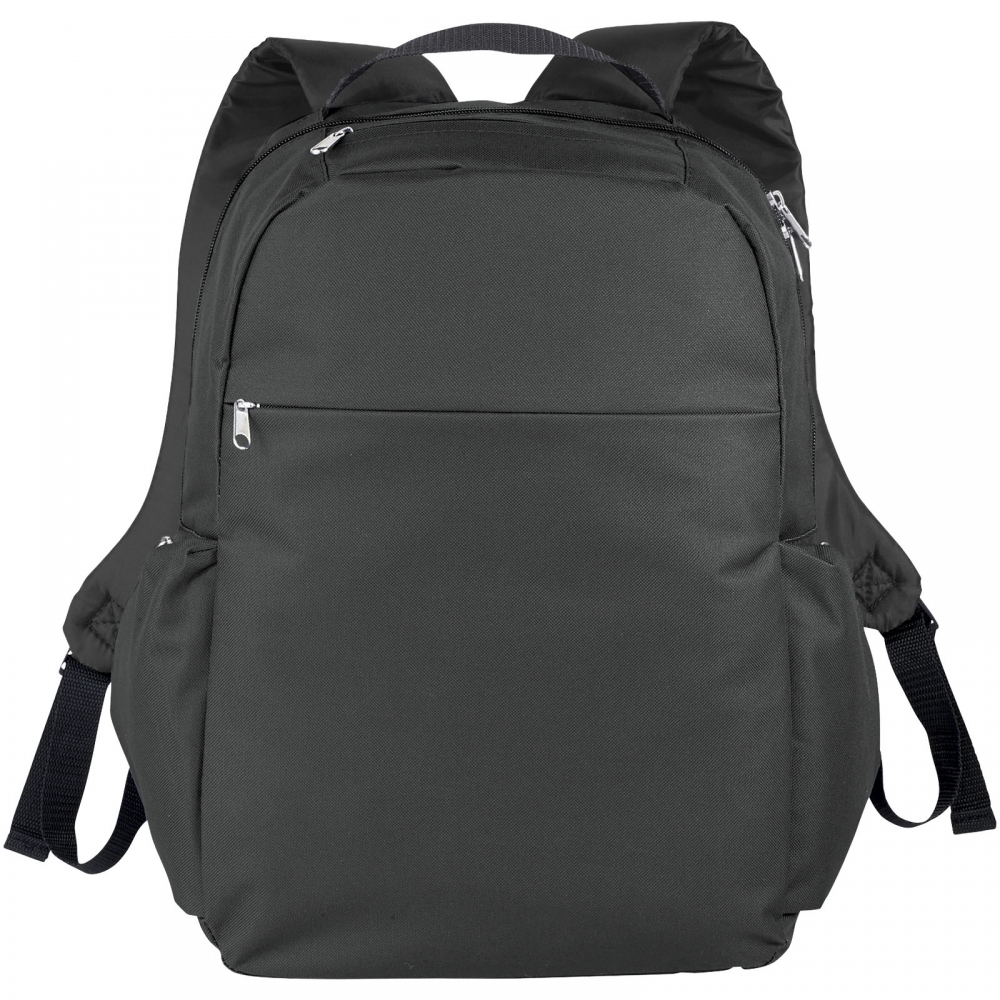 Rucksack mit RFID-Ausleseschutz, mehreren Reißverschlussfächern, gepolstertem Laptopfach (15"), gepolstertem Rücken und Schultergurten sowie eingebautem USB-Anschluss für Powerbanks. Material: 300D Polyester.