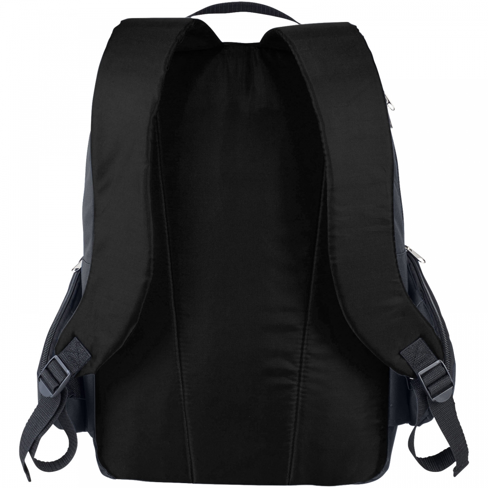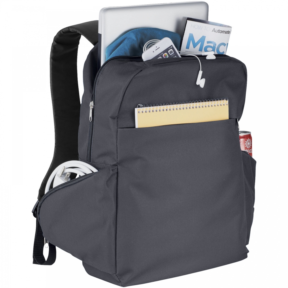 Wasserfester Rucksack mit Reißverschlussfächern, gepolsterten Laptop- (15") und Tabletfach (10"), gepolsterten Rücken und Schultergurten, Kopfhörer-Ausgang und eingebautem USB-Anschluss für Powerbanks. Material: 600D Polyester.