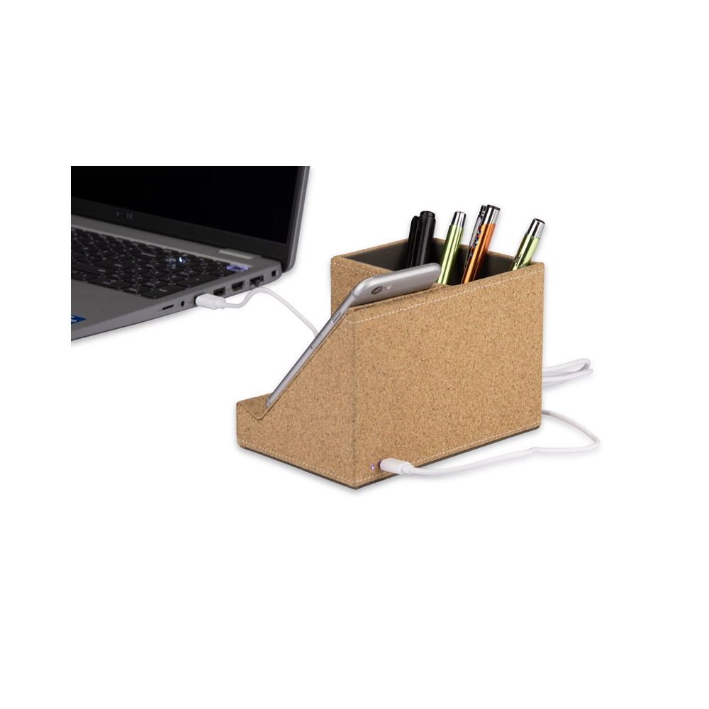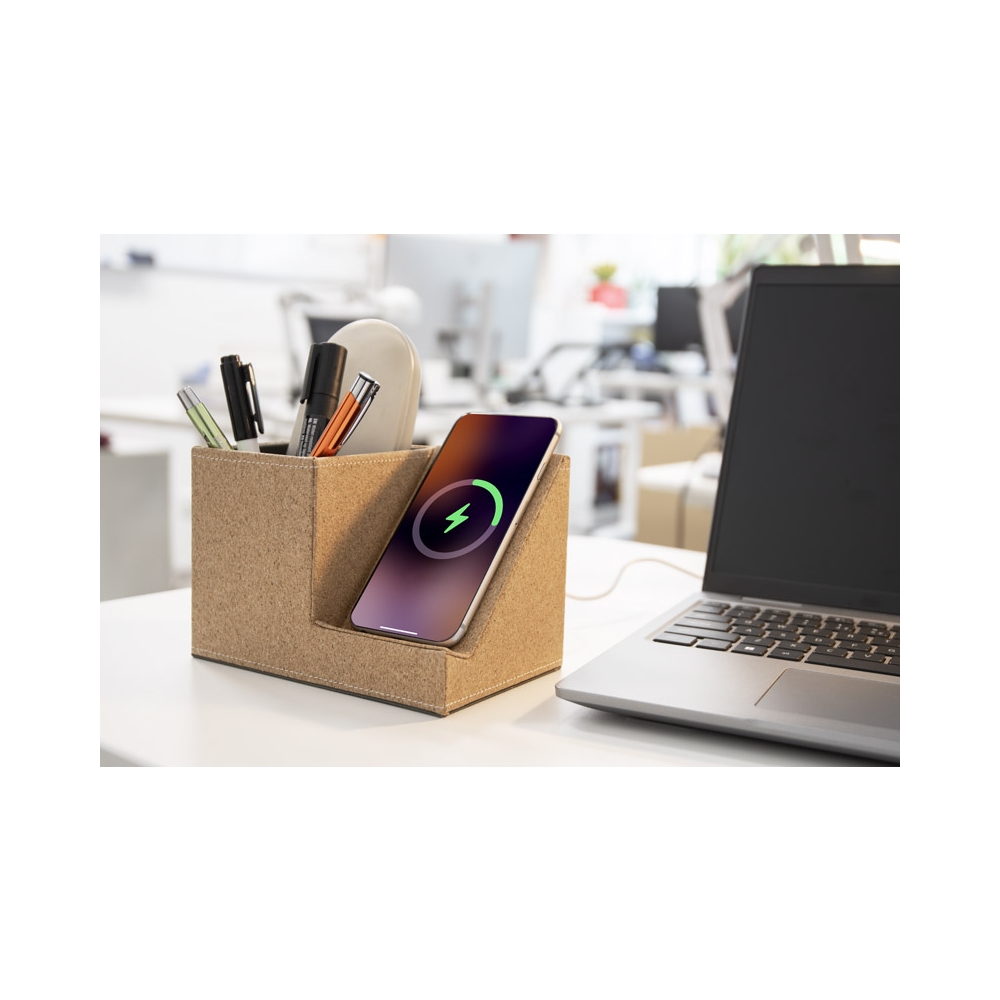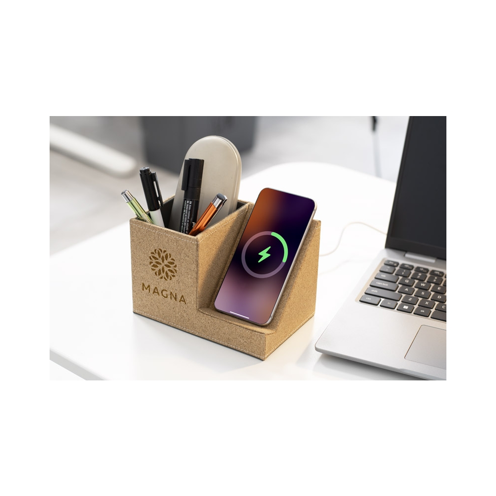 COVBI ist ein funktioneller Schreibtisch-Organizer aus Naturkork. Das Gadget kombiniert einen Werkzeugkasten für Schreibutensilien mit einem kabellosen 15-W-Ladegerät, ideal zum schnellen Aufladen Ihres Smartphones. Darüber hinaus ist ein USB-C-Kabel für eine schnelle und sichere Stromverbindung enthalten. COVBI bringt Ordnung und moderne Technologie in Ihren Arbeitsbereich.