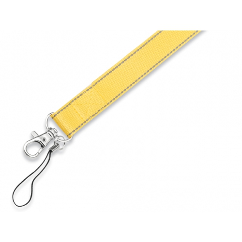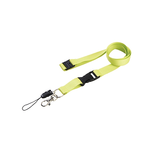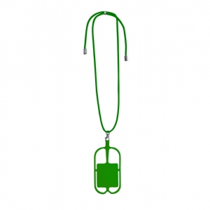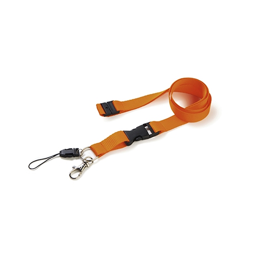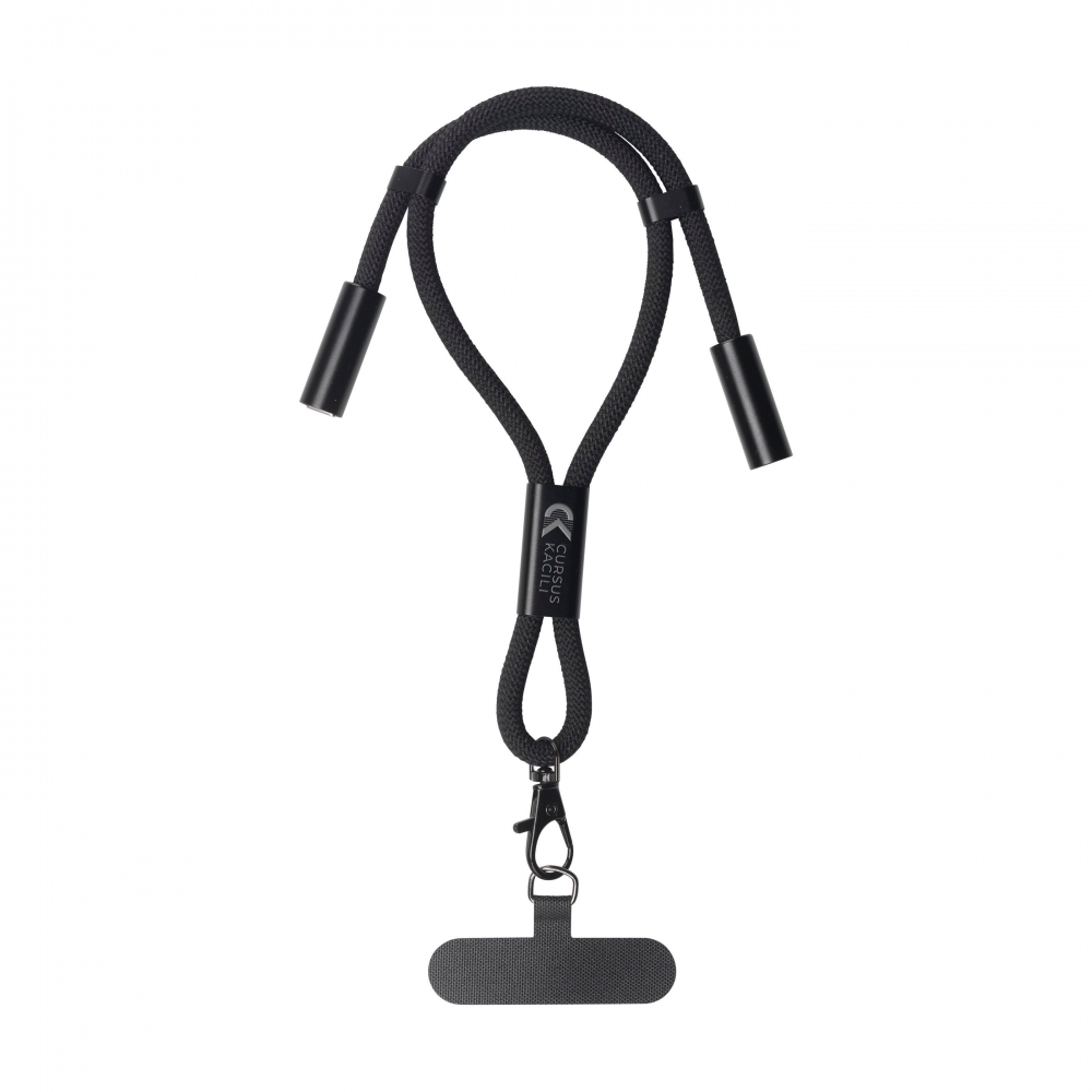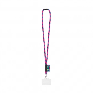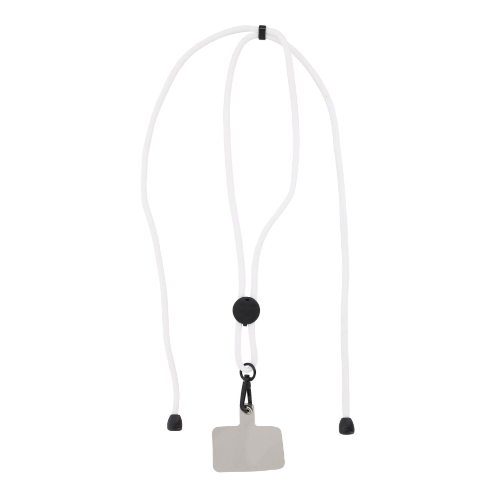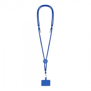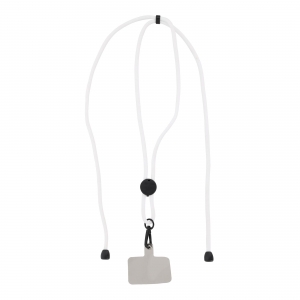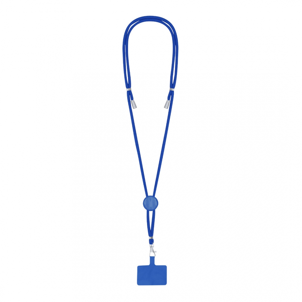 Lanyard mit Smartphone-Zubehör. Aus langlebigem Polyester gefertigt. Tragezubehör zum Platzieren zwischen Etui und Smartphone sowie Metallkarabiner. Kragenversteller, mit Chromdetails an den Enden der Kordeln.