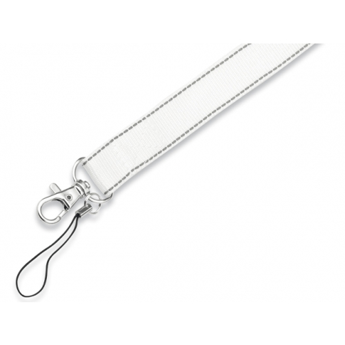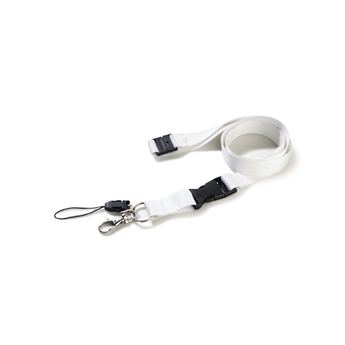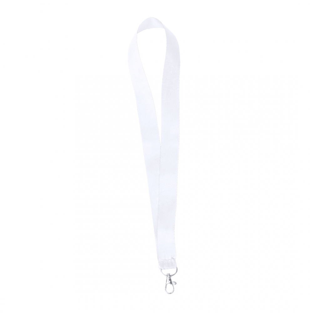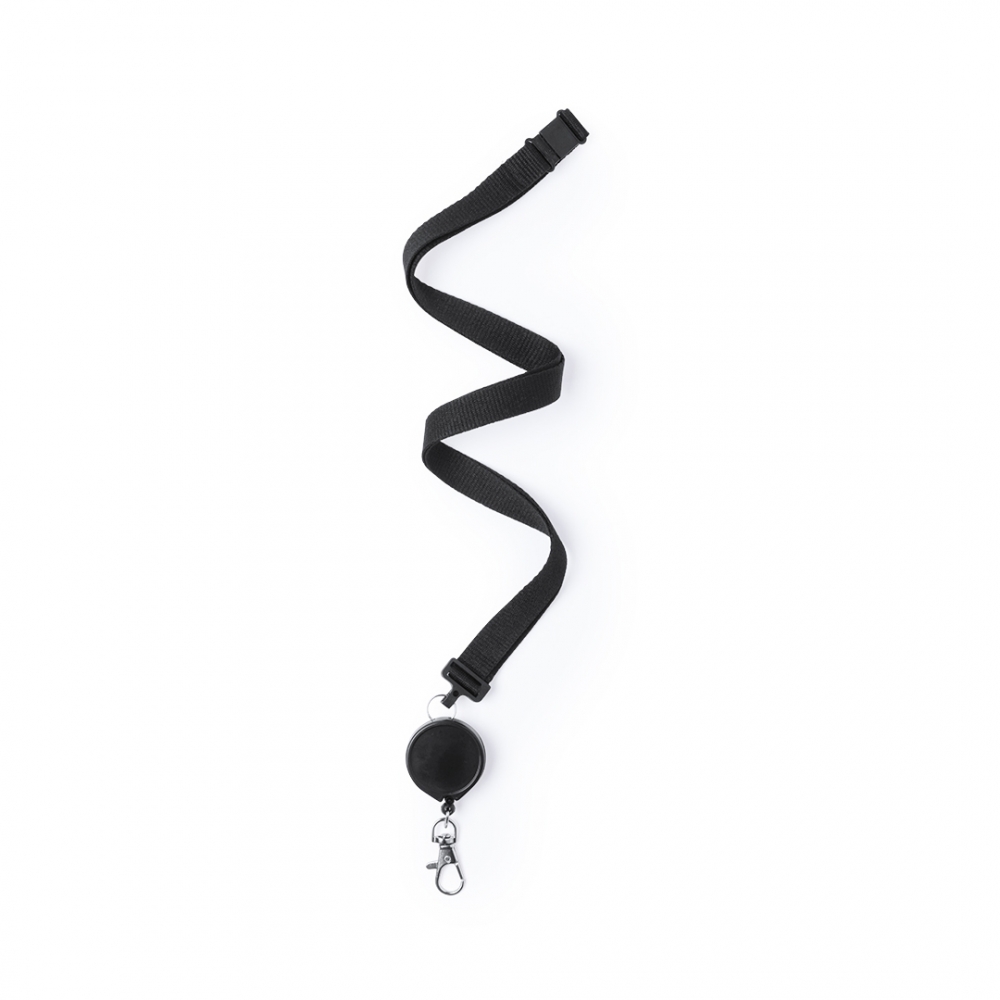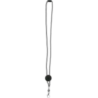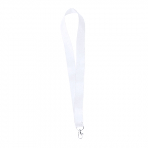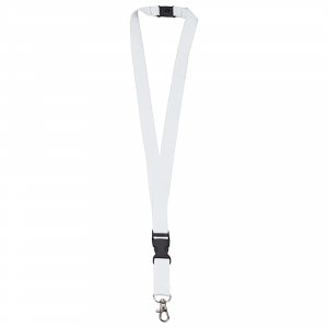 Praktischer Lanyard aus Polyester. Mit Sicherheitsverschluss im Nacken, ausziehbarem Zubehör und Metallkarabiner sowie Clip und Druckfläche für das Logo. Erhältlich in Schwarz und Weiß.