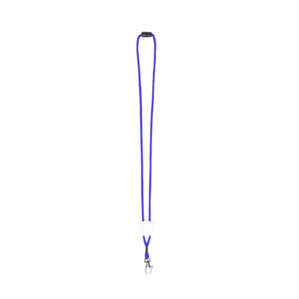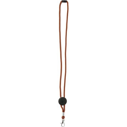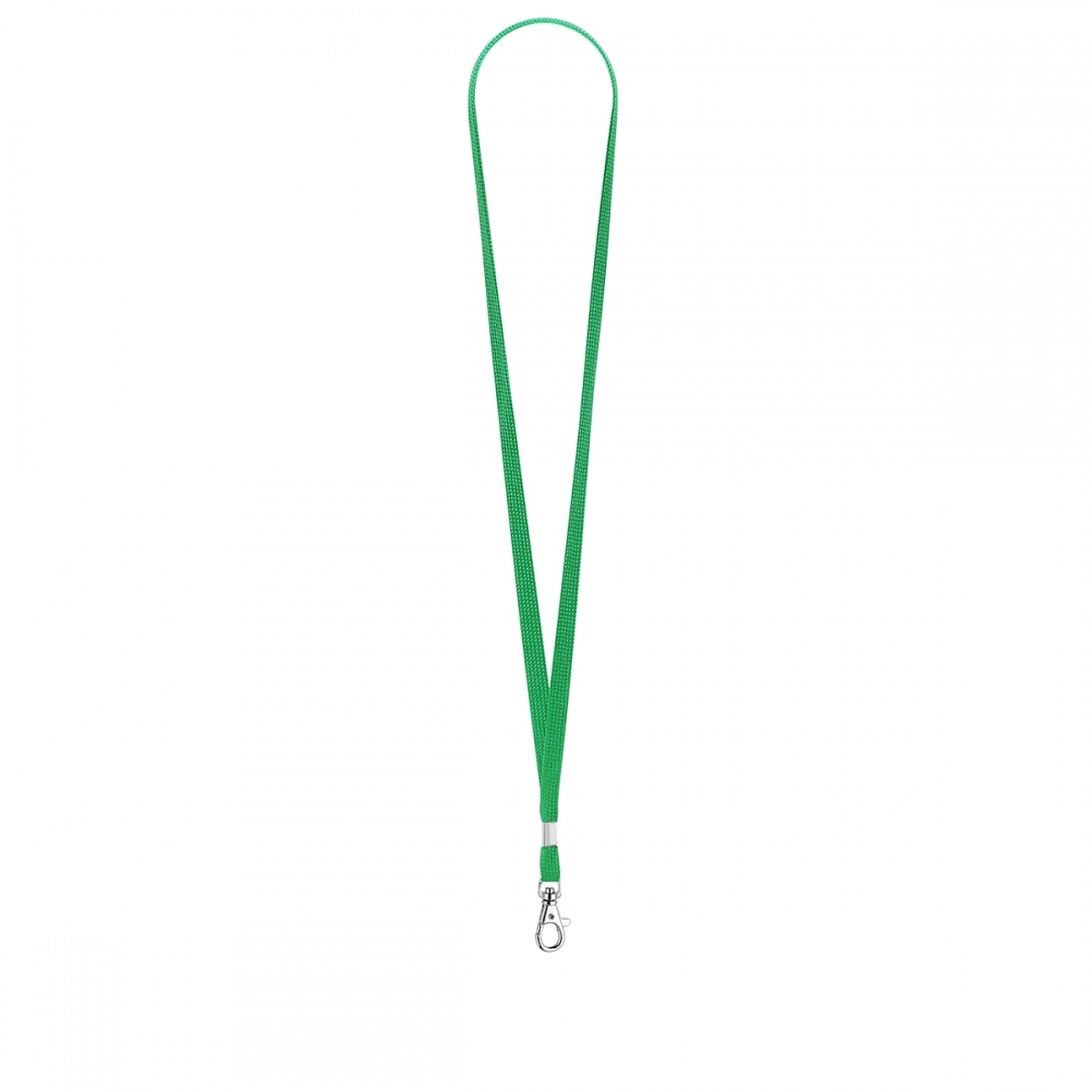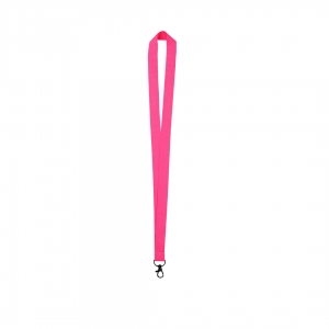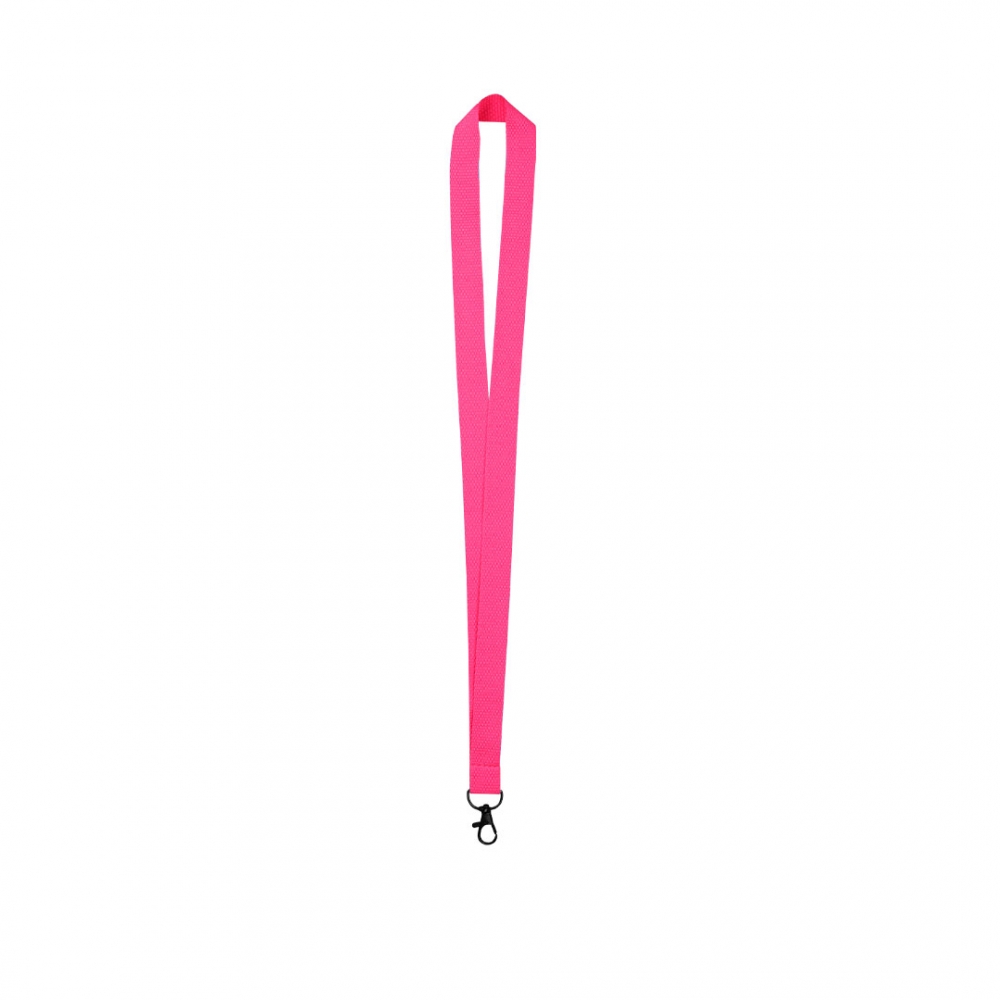 Lanyard mit robuster Kordel aus weichem Polyester in verschiedenen lebendigen Farben. Mit Klickverschluss am Nacken, Befestigungskarabiner aus Metall und zentraler Fläche zum Bedrucken.
