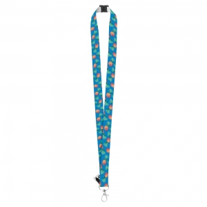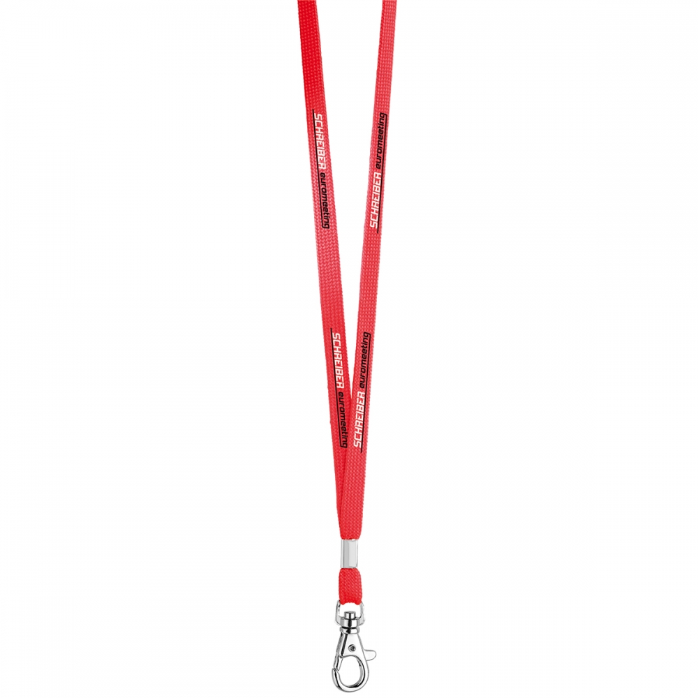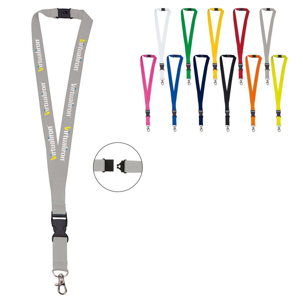 Polyester-Lanyard, 15mm breit, mit abnehmbarem Metall-Karabiner, Panikverschluss und vollfarbiger Bedruckung. Der Preis ist inkl. Sublimationsdruck auf beiden Seiten. Mindestmenge: 100 Stk.