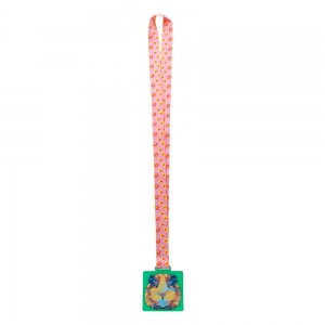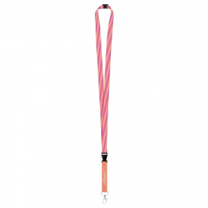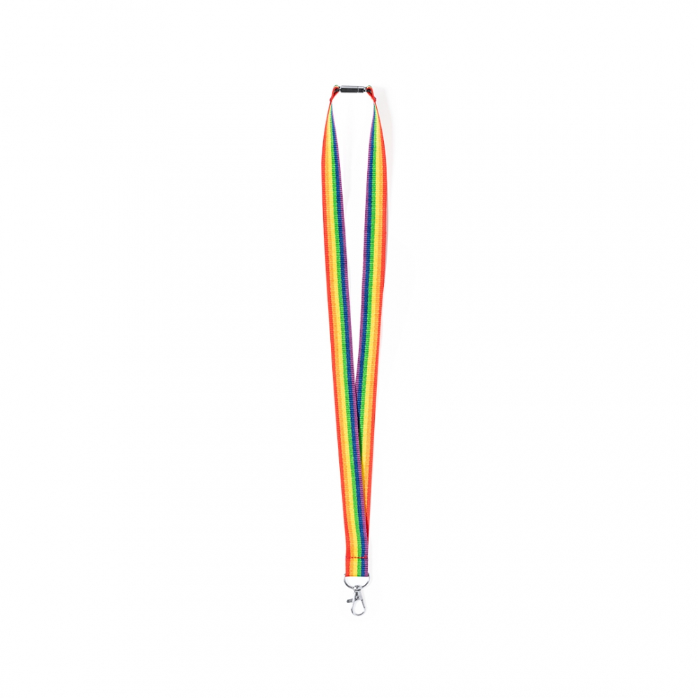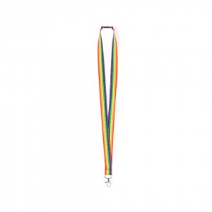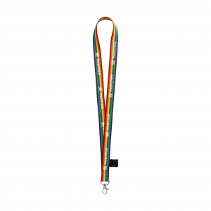 Lanyard in auffälligen und lebendigen Regenbogenfarben. Hergestellt aus 67% GRS-zertifiziertem RPET-Polyester. Mit Karabinerhaken aus Metall.