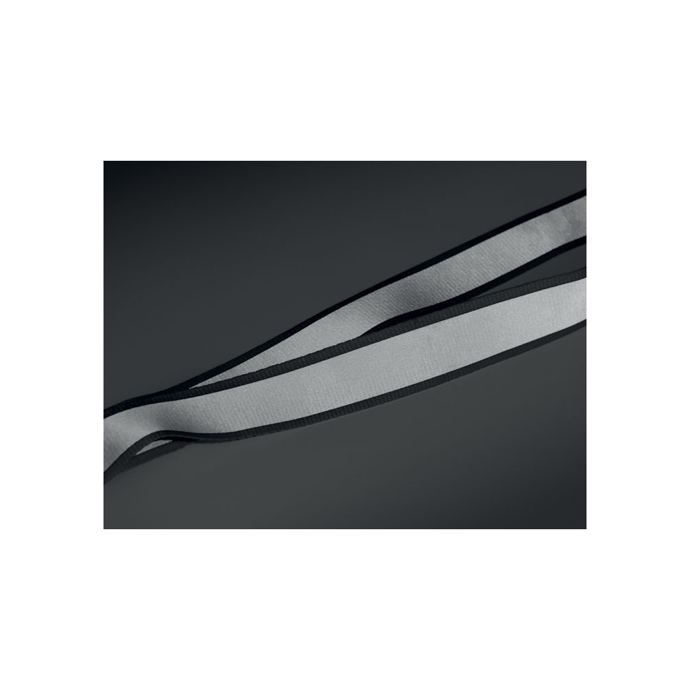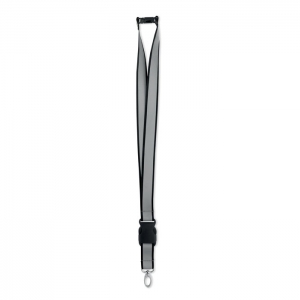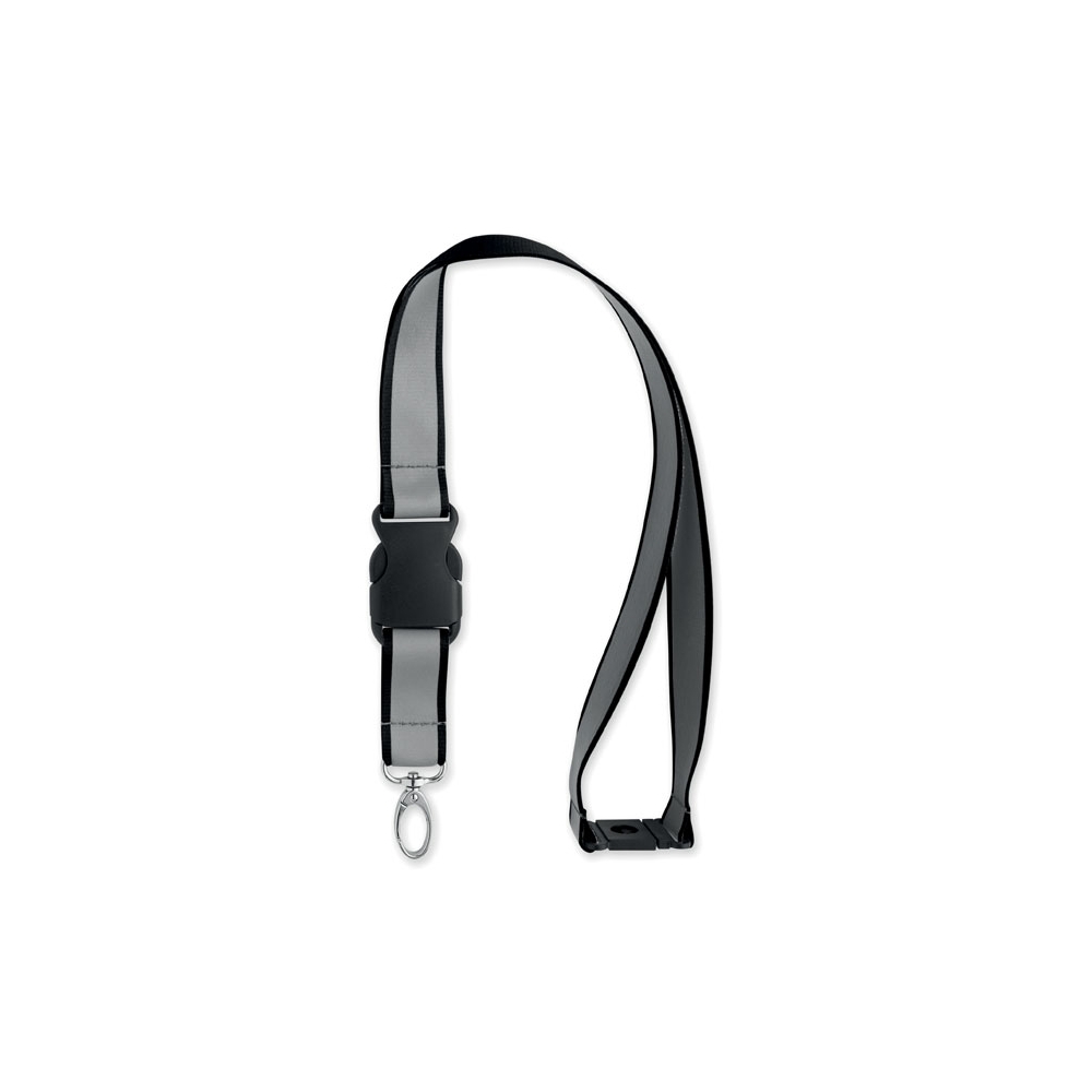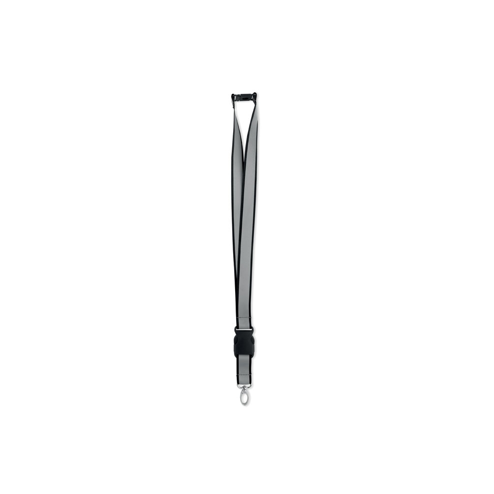 Reflektierendes Lanyard aus RPET-Polyester mit 2,5 cm langem Band, Metallkarabiner, abnehmbarem PP-Steckverschluss und Panikverschluss. Nur für Werbezwecke geeignet.