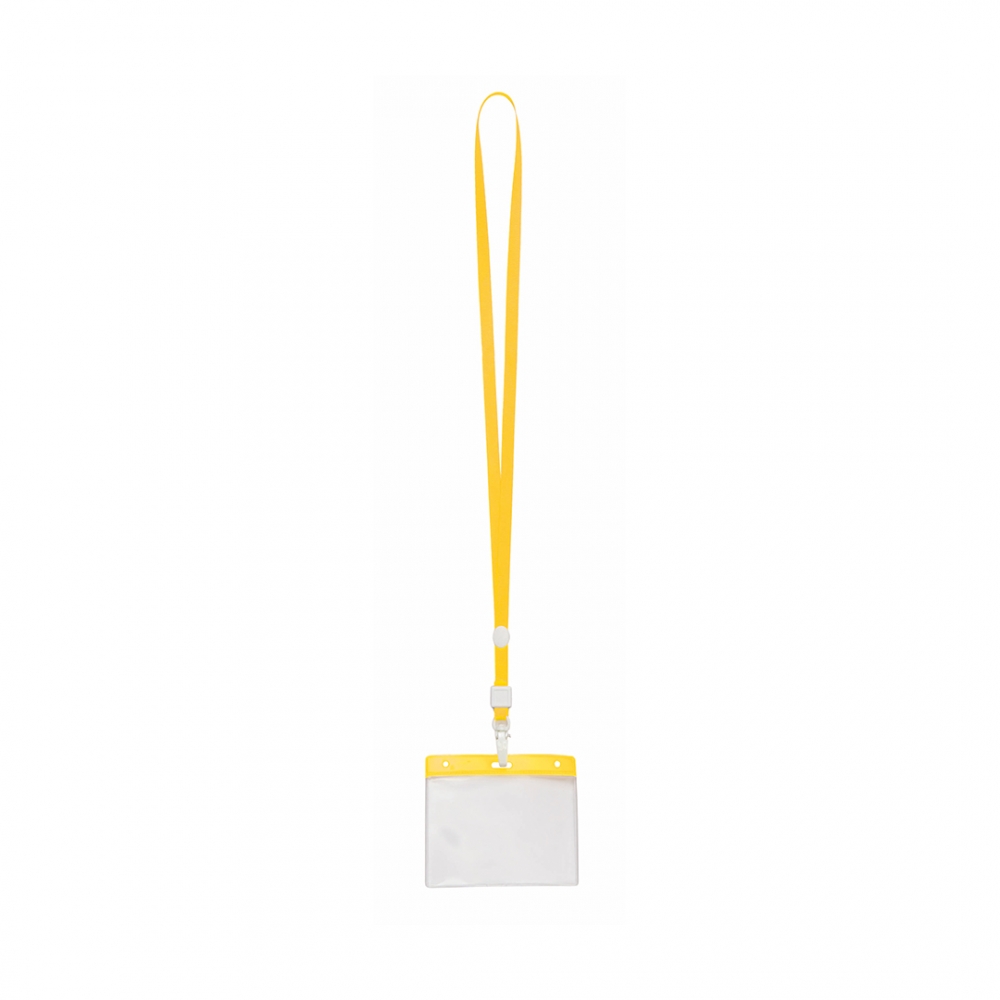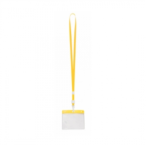 Identifikations-Hülle aus PVC mit farblich passendem Lanyard und Befestigungskarabiner. Runde Druckfläche.