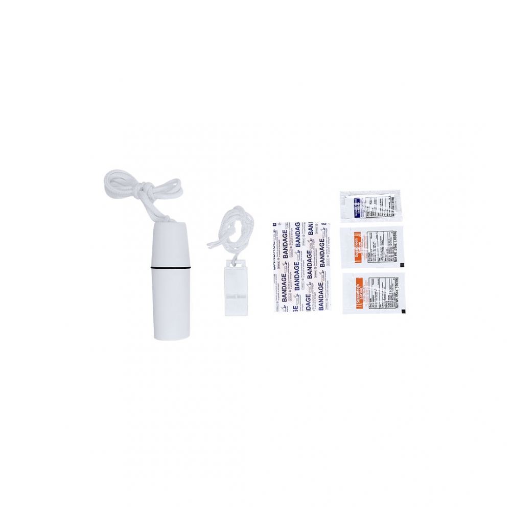 Ausflugsset mit 6 Zubehörteilen, präsentiert in einem robusten ABS-Etui mit wasserdichtem Schraubverschluss, mit praktischem Lanyard-Kordel. Enthält Handdesinfektionsmittel, Sonnencreme SPF30, Pflaster und 1 Pfeife.