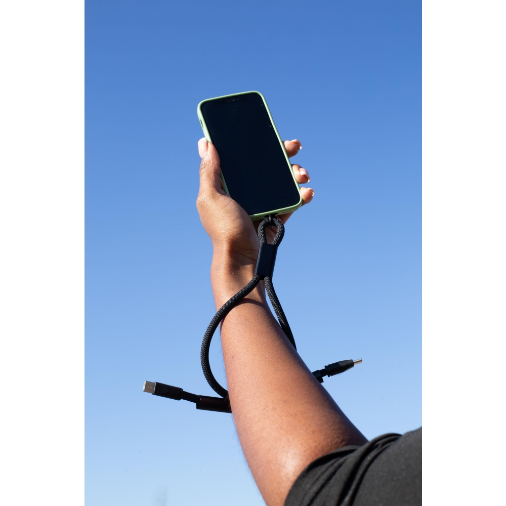 Lanyard 2-in-1-Ladekabel für das Handgelenk. Die Außenseite des Kabels besteht aus 100% recyceltem Polyester. Dieses Zubehör verfügt über ein integriertes USB-C-zu-USB-C-Kabel, das eine Daten- oder Ladeleistung von bis zu 60W unterstützt. Verstellbare Länge für maximalen Tragekomfort um den Hals oder über der Schulter. Mit Metallhaken, D-Ring, verstellbaren Aluminiumschlaufen und TPU-Mobilfunkaufsatz (6 x 2,7 x 1 cm). Ihr Telefon lässt sich leicht befestigen. Ein trendiges Must-Have für alle, die Stil und Komfort verbinden möchten. Auch für Apple CarPlay geeignet. GRS-zertifiziert.